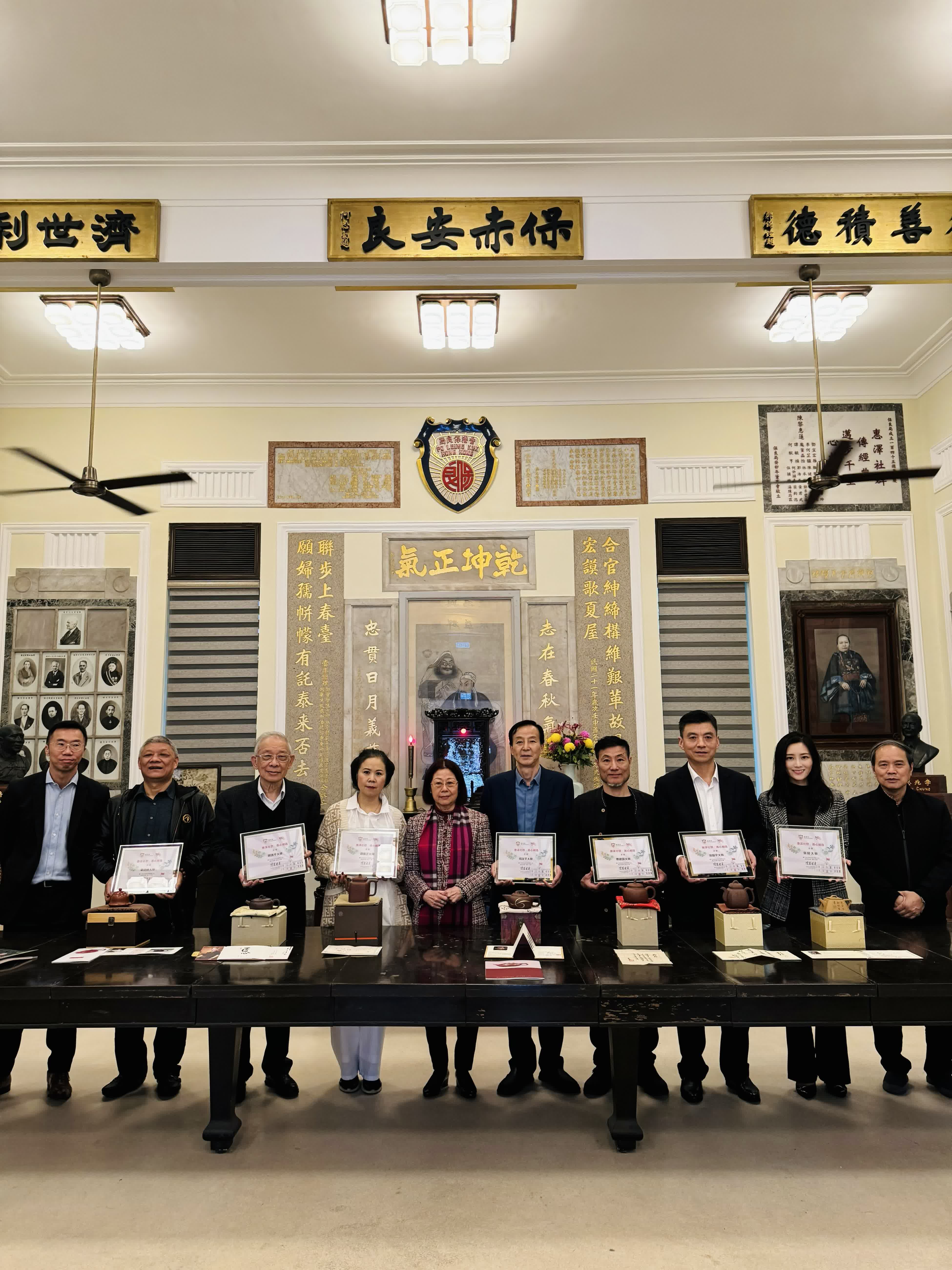 2月28日上午,出席「一壺風雅耀香港」首屆兩地書畫紫砂合作展的中國紫砂文化研究會會長周汝平等七位中國紫砂大師來到保良局,向保良局贈送紫砂藝術壺。