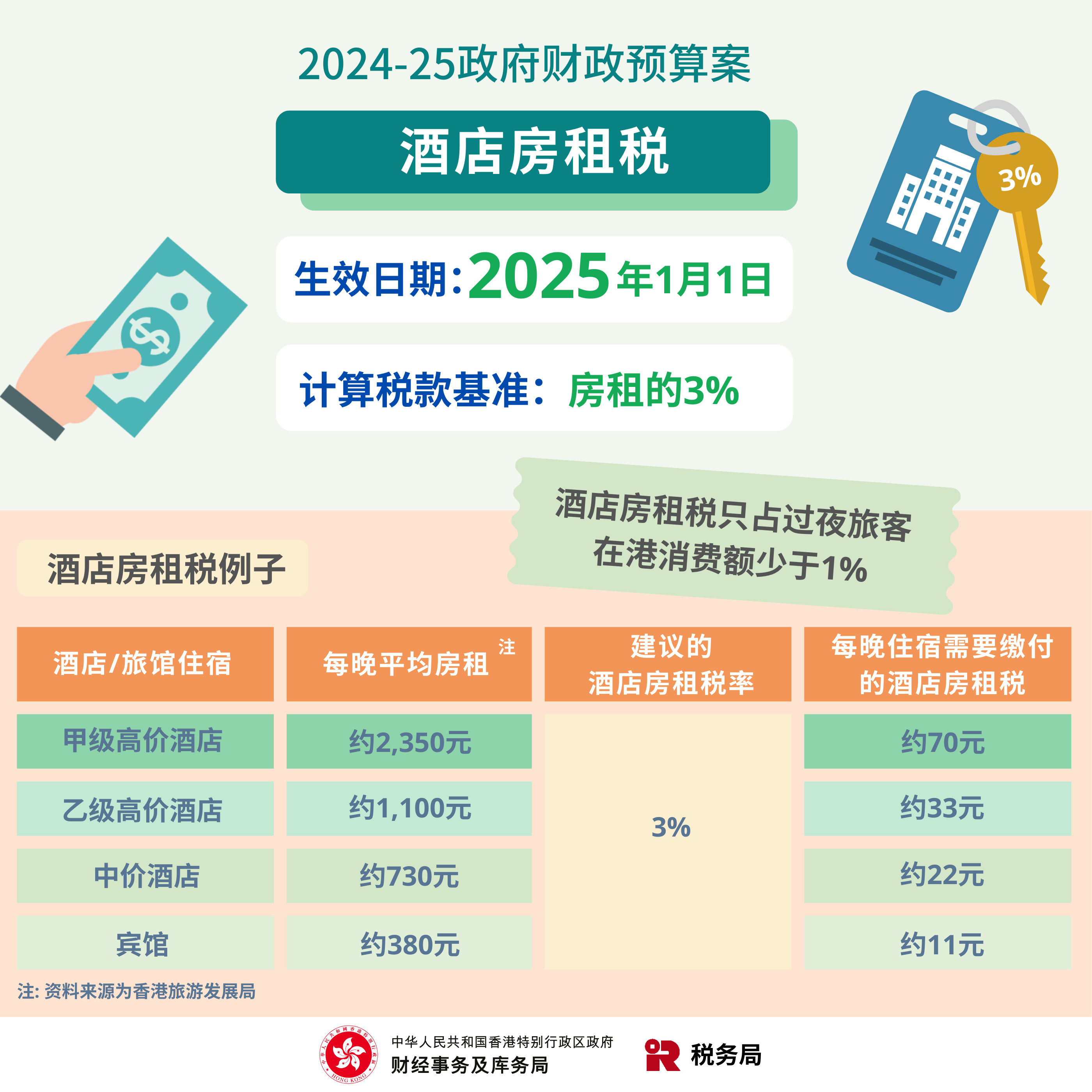 大公文匯全媒體報道,財政預算案提出重新徵收3%酒店房租稅。財政司司長陳茂波今日(29日)在立法會財務委員會會議表示,入住酒店房間的人士都會收取,不會區分本地人或遊客。