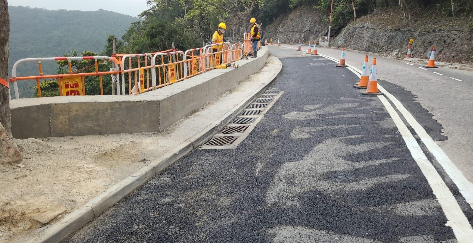 路政署已完成為重開另一條行車線必需的緊急斜坡鞏固工程,包括安裝31支約9至12米長的迷你樁柱,以及在樁柱上設置混凝土冠樑。此外,路政署亦已於有關路段完成渠務改善工程,包括增設排水溝、為鄰近集水坑進行優化工程,以及清理相關渠道,進一步提升路段在惡劣天氣下的排水能力,加強行車道安全。