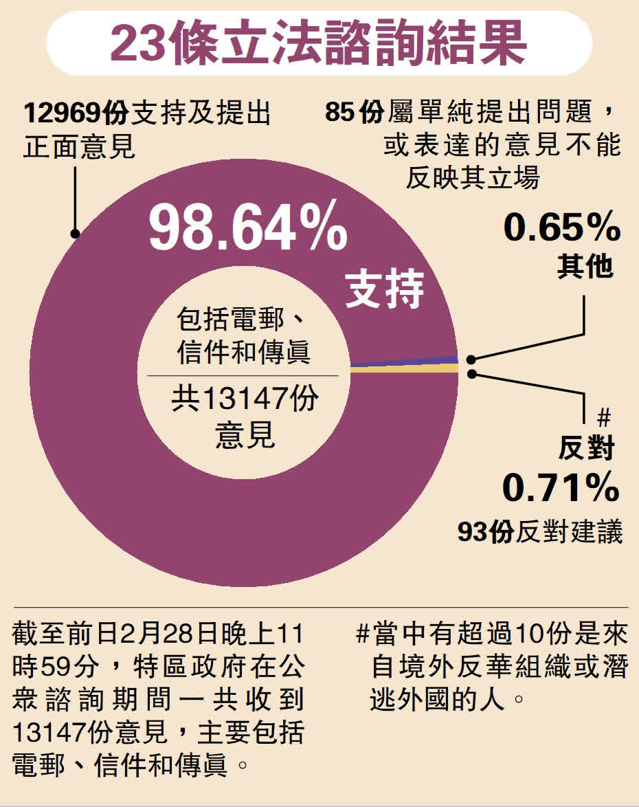 特區政府在基本法第23條立法公眾諮詢期間一共收到13147份意見,當中有12969份支持及提出正面意見。保安局發言人昨天表示,另有85份意見屬單純提出問題,或表達的意見不能反映其立場(佔總數0.65%);反對建議的則為93份(佔總數0.71%,當中有超過10份是來自境外反華組織或潛逃外國的人),上述結果反映立法建議獲大部分市民支持。而就所收到的意見,涵蓋立法建議的不同範疇,亦有其他有關維護國家安全的建議,為擬定條例草案的過程提供寶貴的參考。
