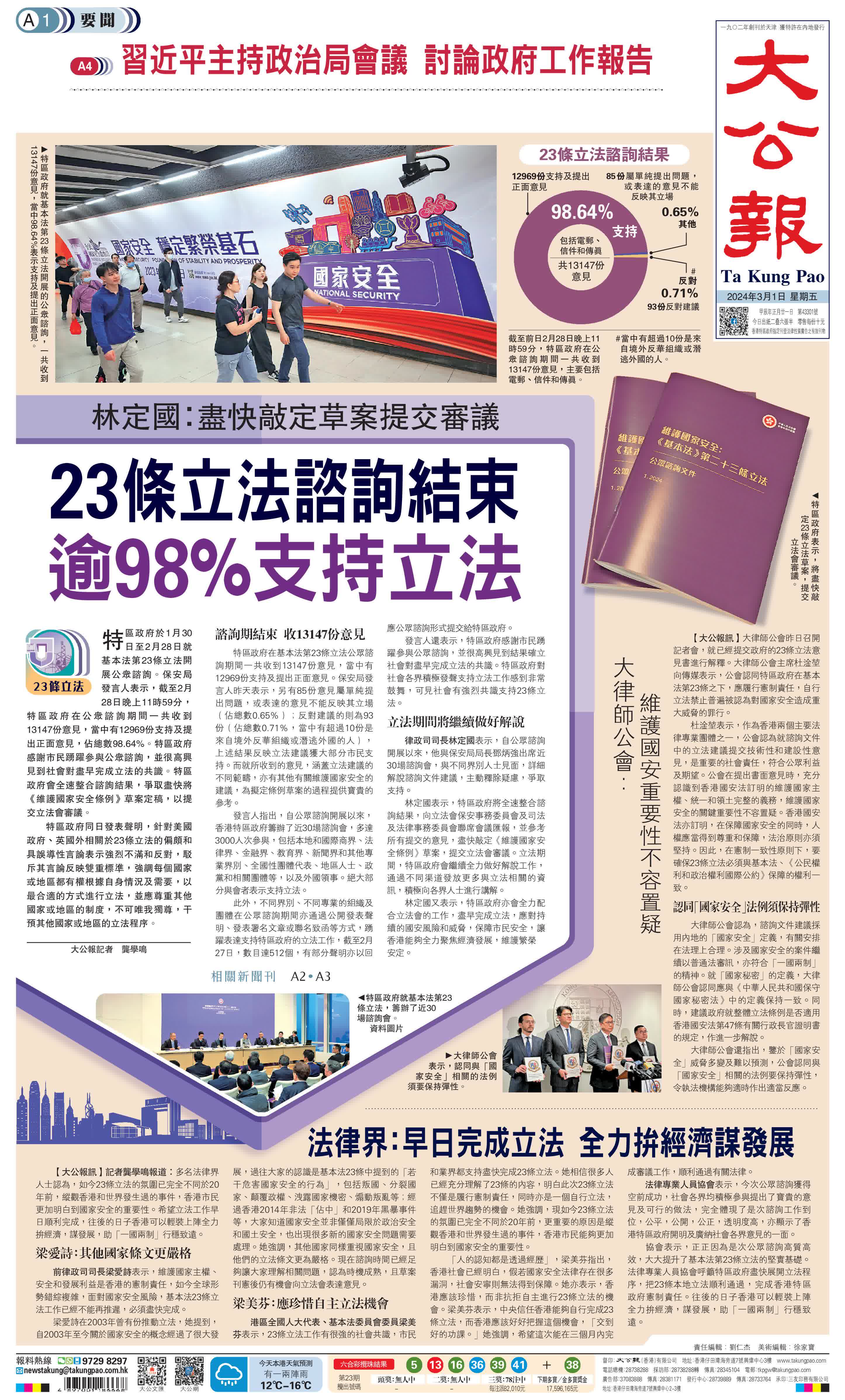 協會表示,正正因為是次公眾諮詢高質高效,大大提升了基本法第23條立法的堅實基礎。法律專業人員協會呼籲特區政府盡快展開立法程序,把23條本地立法順利通過,完成香港特區政府憲制責任。往後的日子香港可以輕裝上陣全力拚經濟,謀發展,助「一國兩制」行穩致遠。