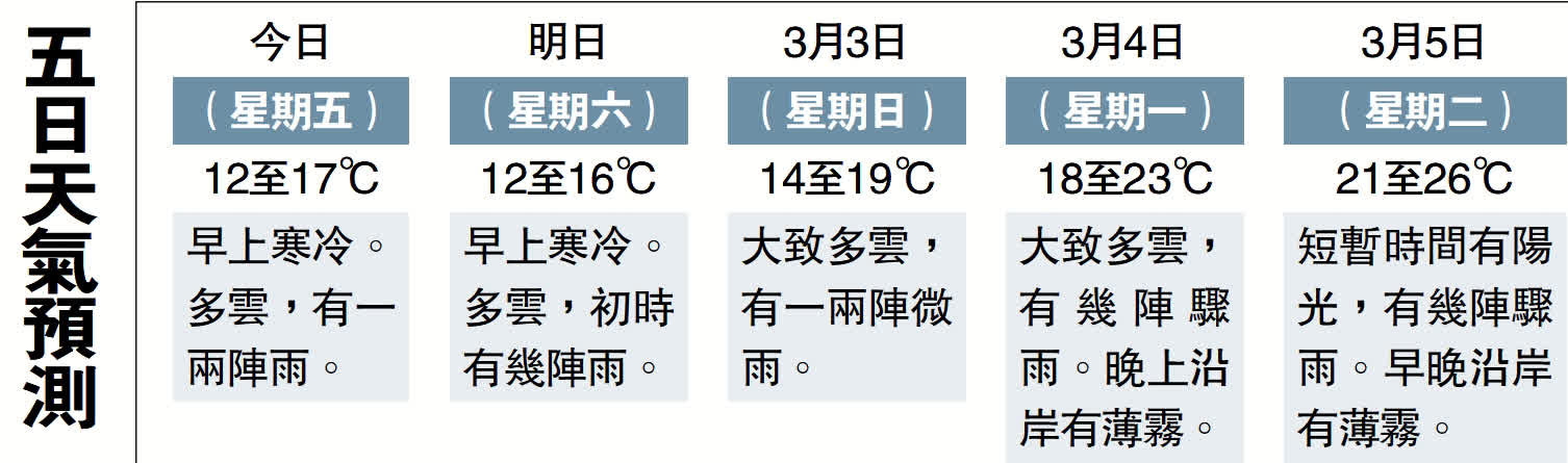 天文台昨日中午發出特別天氣提示,受東北季候風及一道廣闊雲雨帶影響,未來一兩日有幾陣雨,吹清勁北風,下周初氣溫逐步回升。天文台指,今早相當清涼,而周六早上寒冷,呼籲市民應留意天氣變化,注意保暖,多穿禦寒衣物,並關顧長者及慢性病患者。