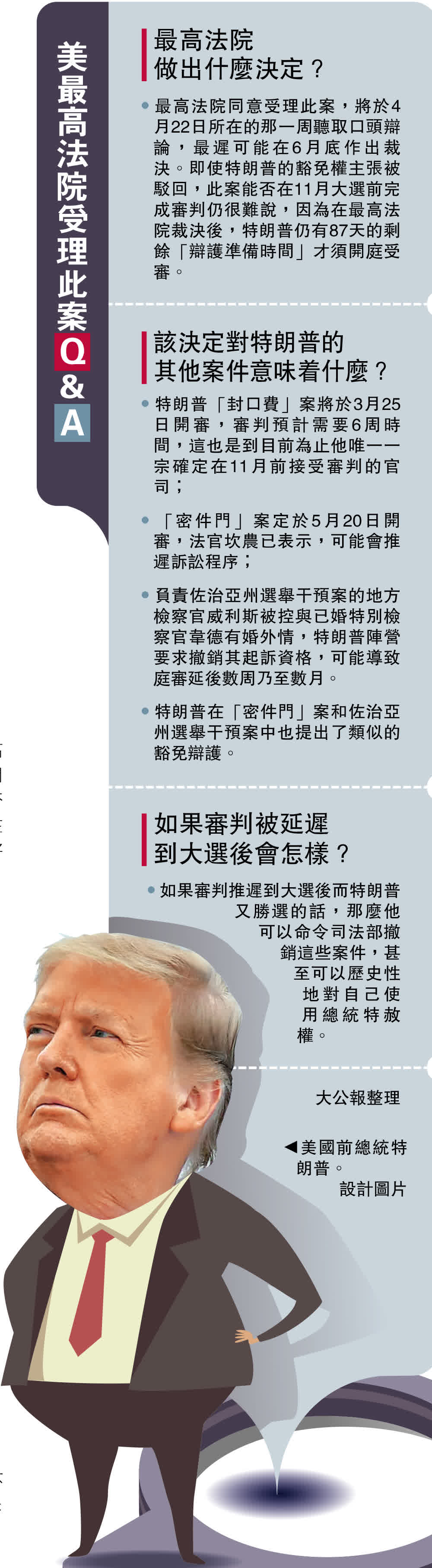 特朗普目前面臨4宗刑事官司,其中唯一有確定審判日期的是他在紐約州的「封口費」案,將於3月25日開審。他在佛州的「密件門」案定於5月20日開庭,但4月底的聽取辯論或有可能導致庭審推遲。負責佐治亞州選舉干預案的地方檢察官威利斯被控與已婚特別檢察官韋德有婚外情,特朗普陣營要求撤銷其起訴資格,可能導致庭審延後數周乃至數月。