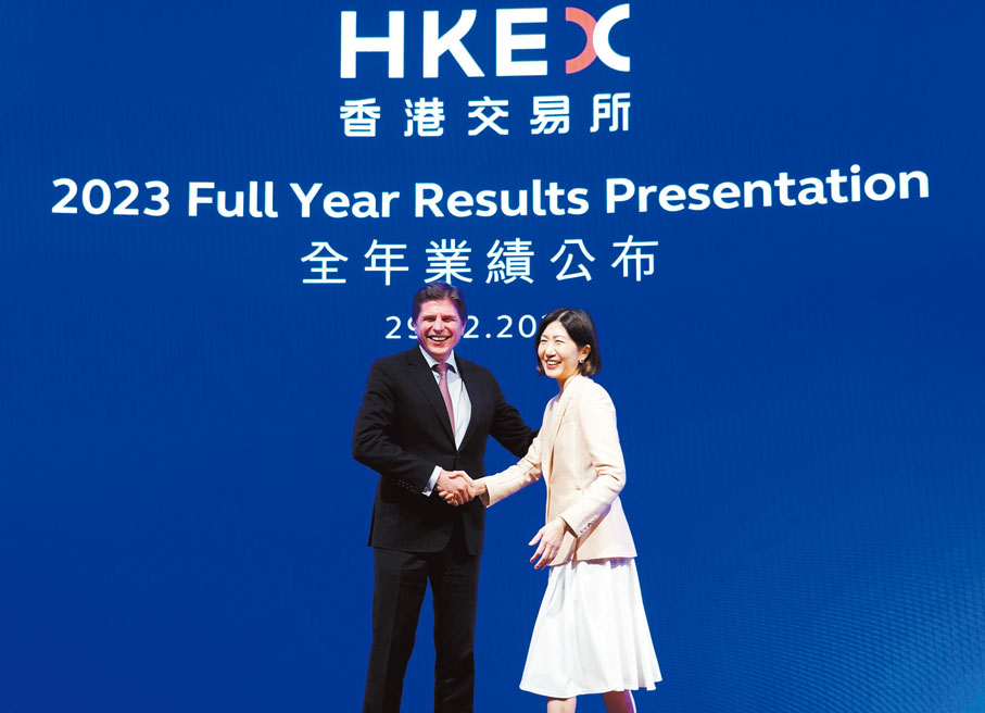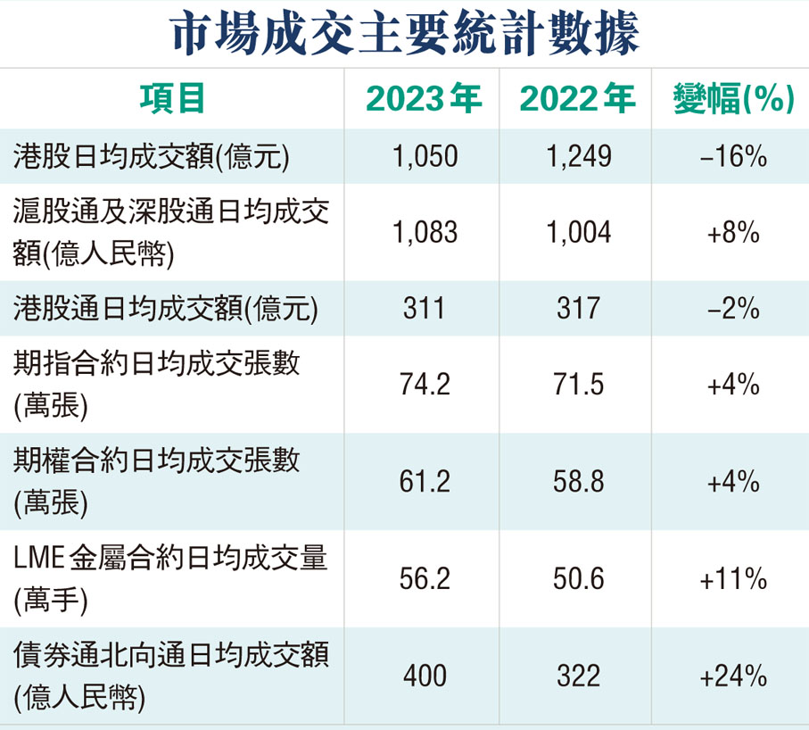 滬深港通在去年的表現持續強韌穩健,北向和南向交易的日均成交額,分別達到1,083億元人民幣、與311億元,為去年帶來22億元的收入及其他收益。此外,債券通北向通去年日均成交額再創新高,達到400億元人民幣,較2022年大升24%。衍生產品市場的成交量也升4%,達到140萬張合約。