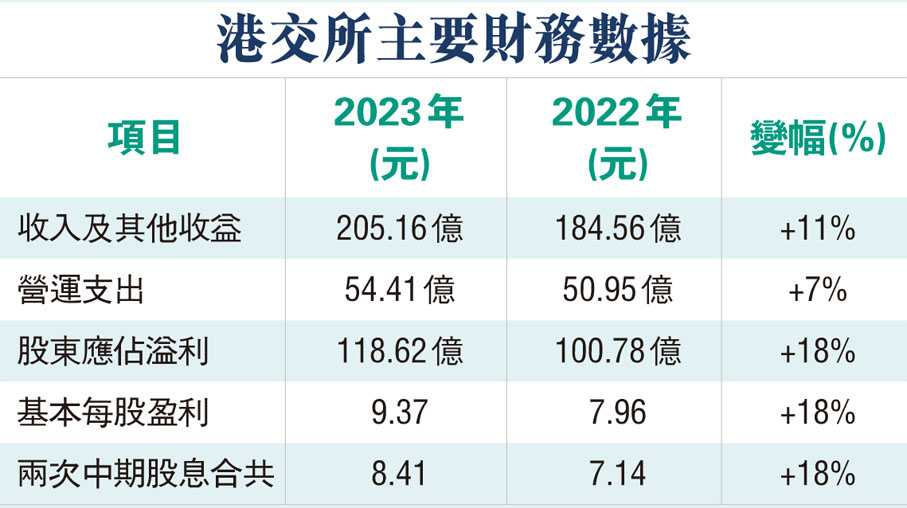 港股去年交投和新股活動有所放緩,但在高息環境下,來自保證金、公司資金等財務資產的投資收益淨額,有超過49億元,創紀錄新高,是帶動港交所全年純利回升18%的主因。該所去年純利118億元,僅次於2021年,是歷來第二高。