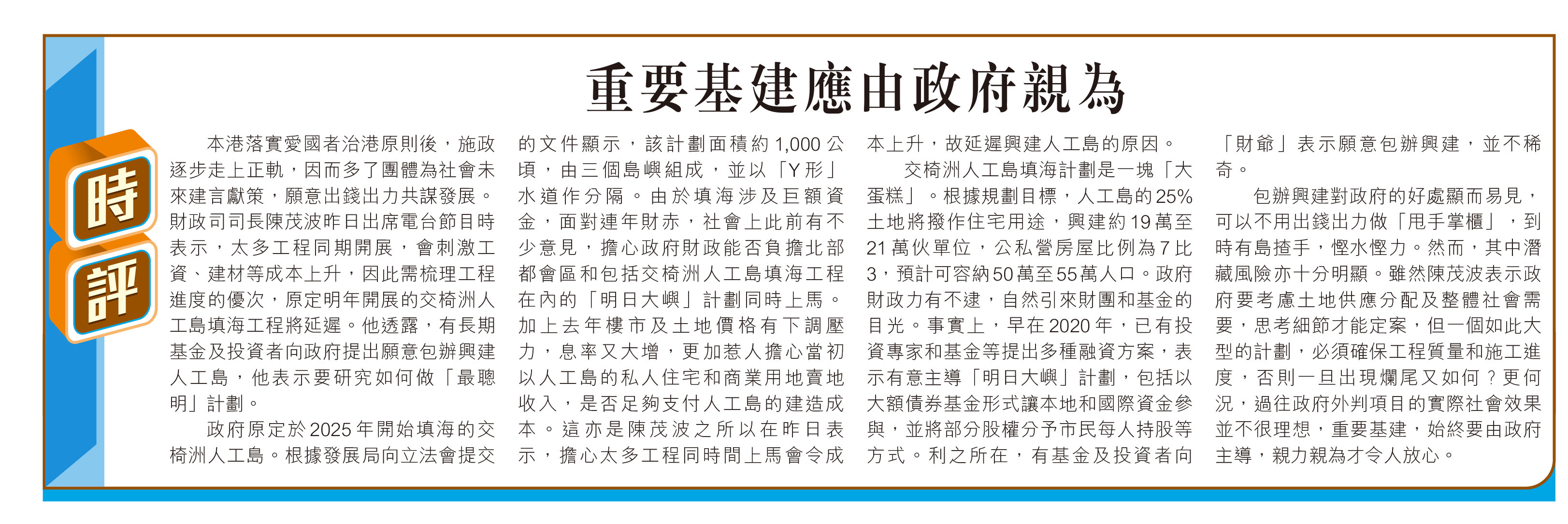 本港落實愛國者治港原則後,施政逐步走上正軌,因而多了團體為社會未來建言獻策,願意出錢出力共謀發展。財政司司長陳茂波昨日出席電台節目時表示,太多工程同期開展,會刺激工資、建材等成本上升,因此需梳理工程進度的優次,原定明年開展的交椅洲人工島填海工程將延遲。他透露,有長期基金及投資者向政府提出願意包辦興建人工島,他表示要研究如何做「最聰明」計劃。