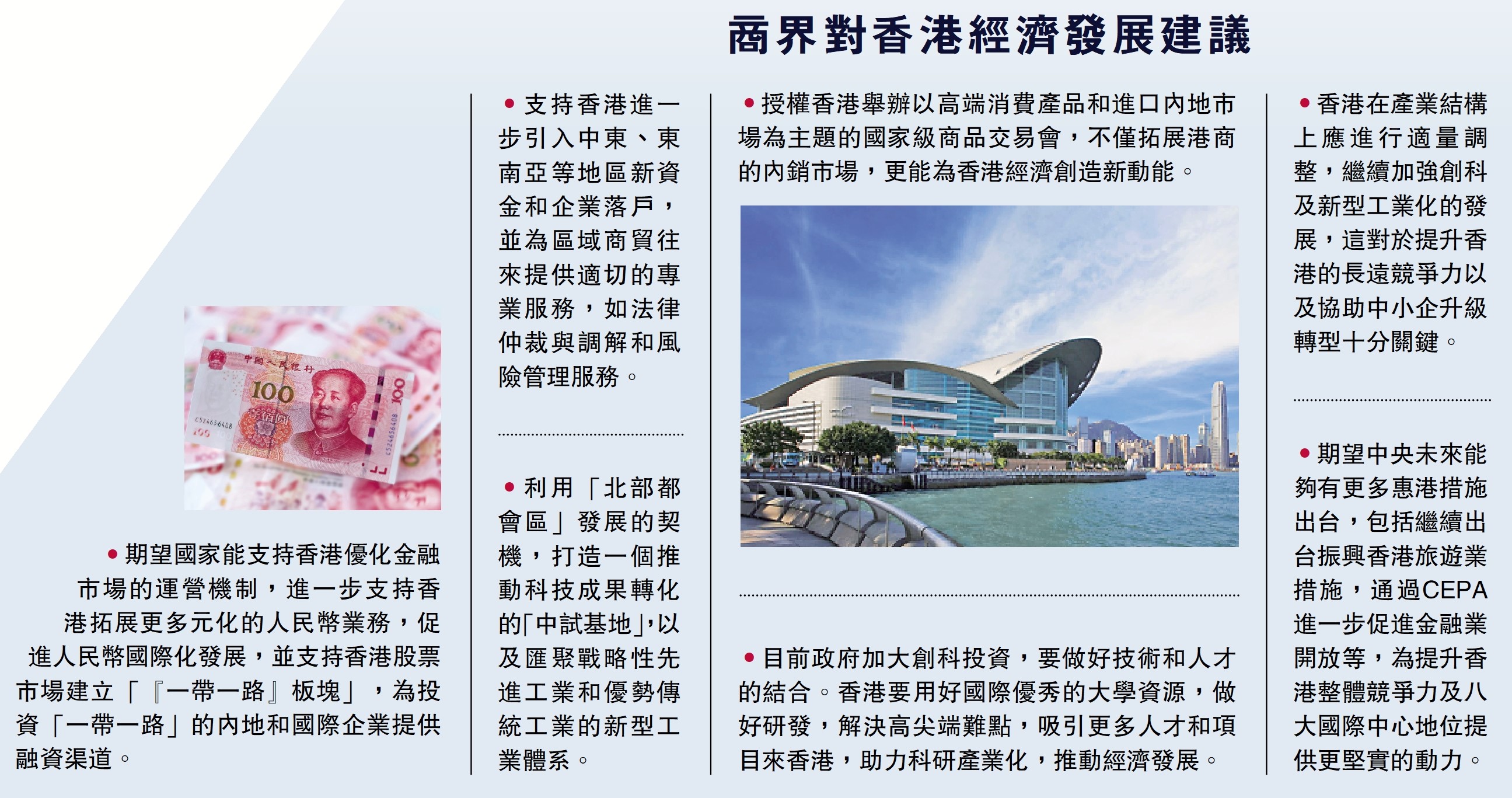 「中央一直關心香港的民生福祉,支持香港的經濟發展,我們對香港中、長期經濟前景抱有絕對的信心。」多個商會代表接受《大公報》訪問時就香港的經濟發展提出建議和看法,包括鞏固和提升香港在金融、創科等領域發展優勢,調整產業結構,舉辦高端交易會等。他們指出,香港必須堅定信心,充分發揮「一國兩制」的獨特優勢,高質量對接粵港澳大灣區建設,「香港經濟迎來柳暗花明只是時間問題。」