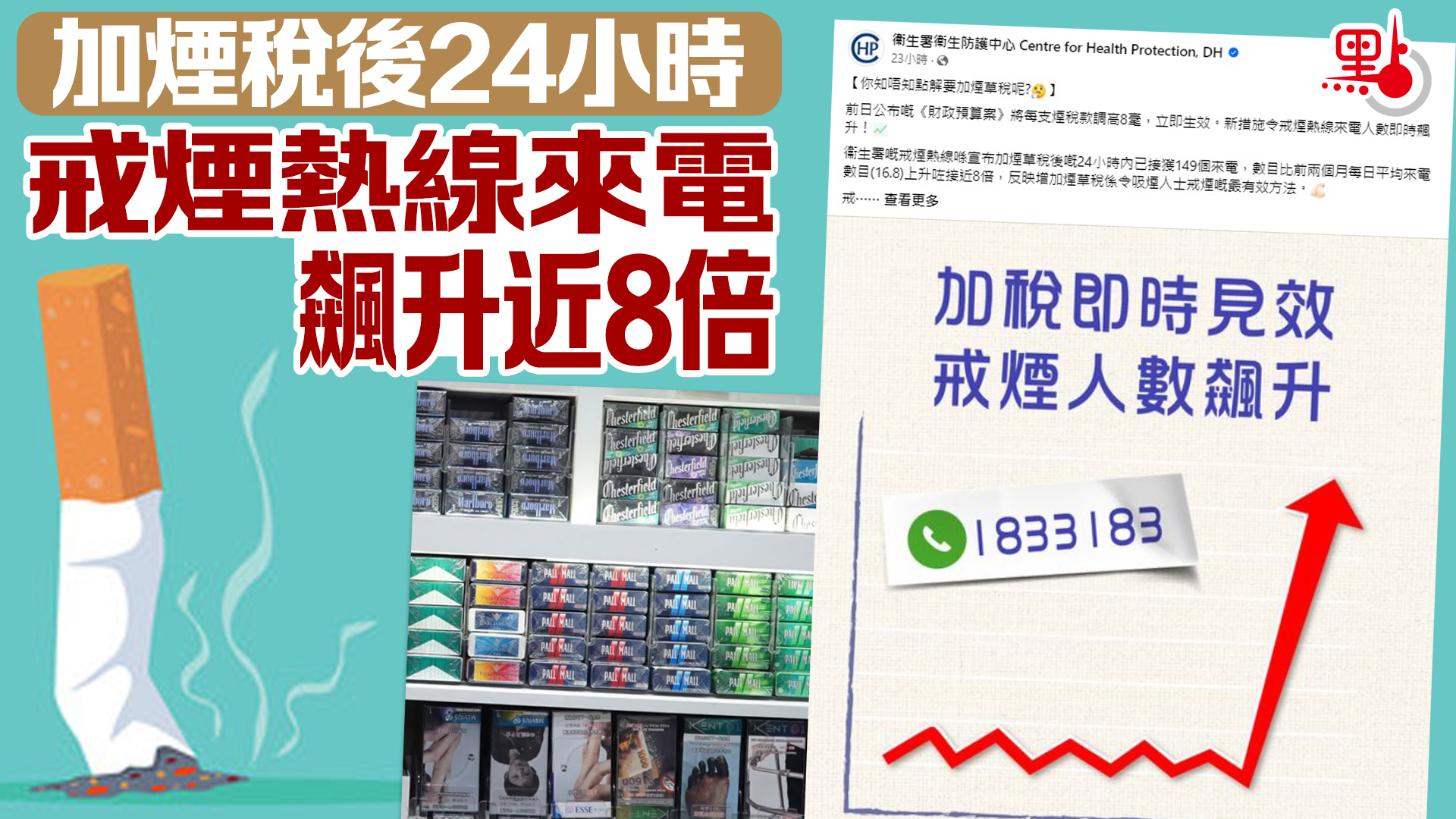 衞生署的戒煙熱線在宣布加煙草稅後的24小時內已接獲149個來電,數目比前兩個月每日平均來電數目(16.8)上升接近8倍,反映增加煙草稅係令吸煙人士戒煙的最有效方法。