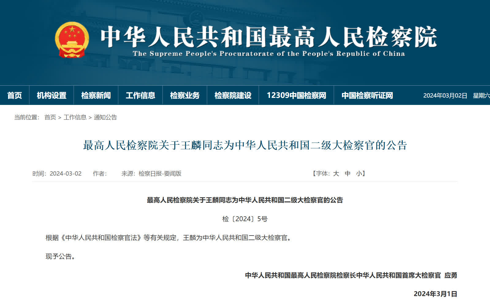 大公文匯網報道,今日(3月2日),最高人民檢察院網站發布公告,根據《中華人民共和國檢察官法》等有關規定,王麟為中華人民共和國二級大檢察官。