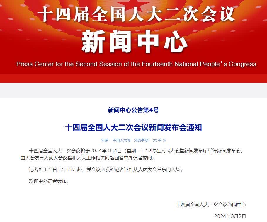 據央視網報道,十四屆全國人大二次會議將於2024年3月4日(星期一)12時在人民大會堂新聞發布廳舉行新聞發布會,由大會發言人就大會議程和人大工作相關問題回答中外記者提問。