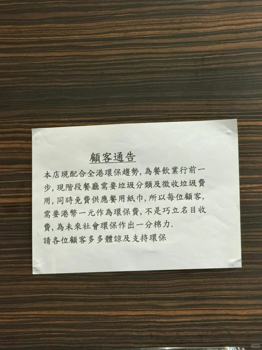 早前有網民在小紅書以「啊?堂食也要收費?眾籌給餐廳買垃圾袋?」發文,指自己在香港「金X」茶餐廳食飯,埋單時發現一行6人,每人都被加收1元「環保費」,店內則張貼了「顧客通告」,標明「環保費」的緣由。