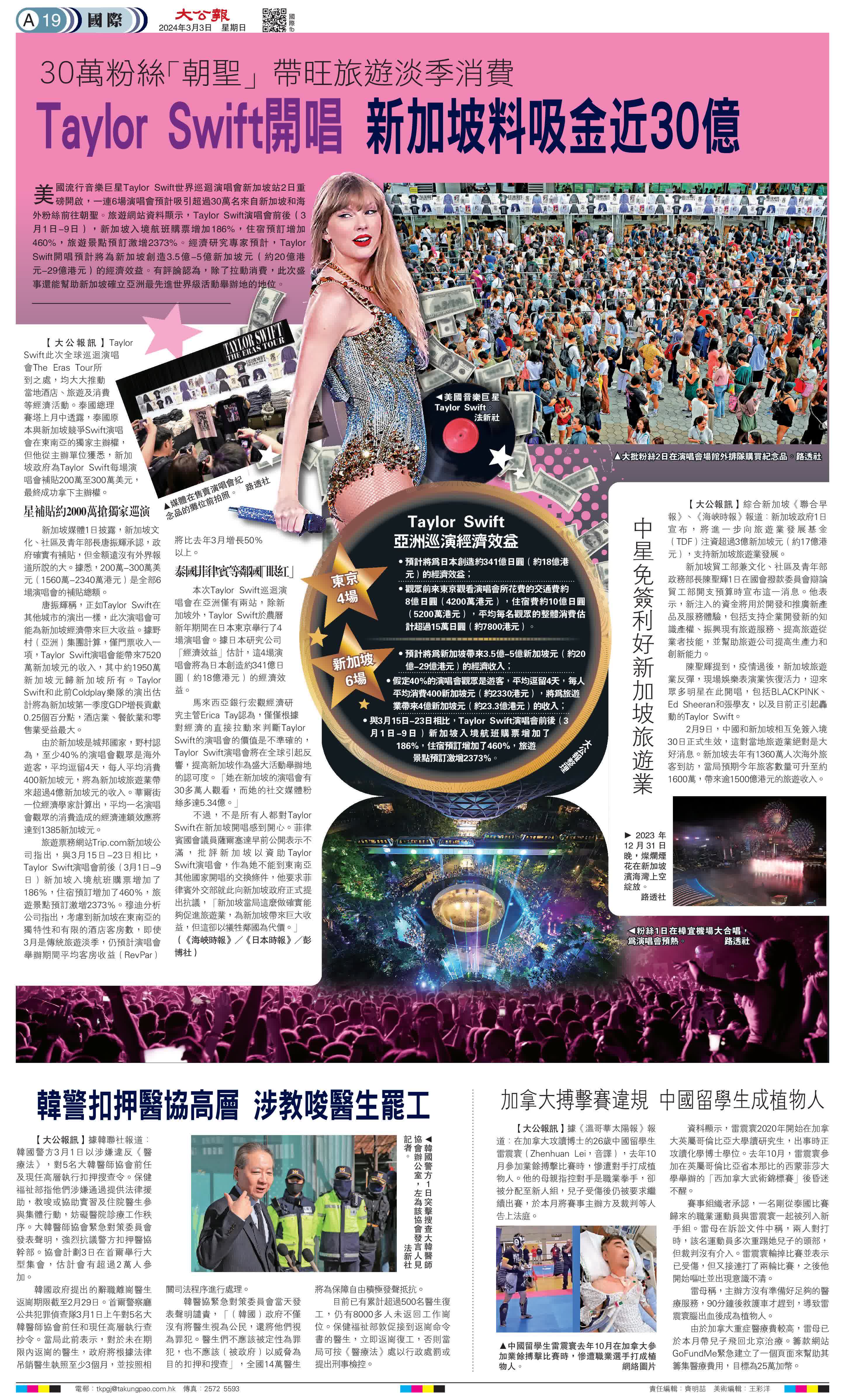 大公報綜合新加坡《聯合早報》、《海峽時報》報道,美國流行音樂巨星Taylor Swift世界巡迴演唱會新加坡站2日重磅開啟,一連6場演唱會預計吸引超過30萬名來自新加坡和海外粉絲前往朝聖。旅遊網站資料顯示,Taylor Swift演唱會前後(3月1日—9日),新加坡入境航班購票增加186%,住宿預訂增加460%,旅遊景點預訂激增2373%。經濟研究專家預計,Taylor Swift開唱預計將為新加坡創造3.5億~5億新加坡元(約20億港元~29億港元)的經濟效益。有評論認為,除了拉動消費,此次盛事還能幫助新加坡確立亞洲最先進世界級活動舉辦地的地位。