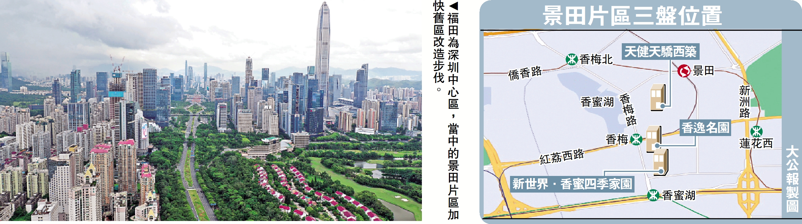 景田片區雖然與香蜜湖只隔着一條香梅路,但每平米均價低香蜜湖至少5萬元,原因包括樓齡較舊、地積比率高,以及較少新樓盤。不過,該片區正迎來建設高潮,大量保障房規劃動工。德佑地產景田片區置業經理劉全透露,正在進行棚戶改造的香蜜二村拆除範圍用地2.94萬平米,開發用地2.77萬平米,規劃面積15.25萬平米,其中住宅面積12.77萬平米,商業面積1.3萬平米。項目建設的住宅在滿足本項目回遷需求後,其餘作為人才和保障性住房。根據規劃草案,項目將興建7幢23至48層住宅樓、一所9班幼兒園及部分商業配套。