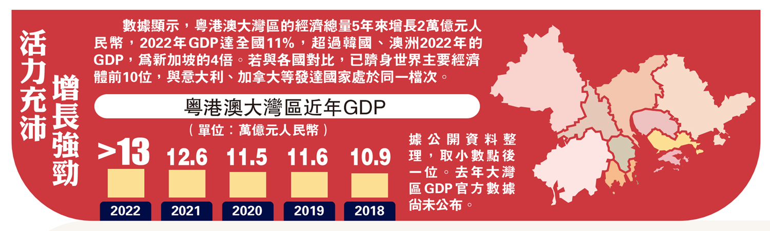 數據顯示,粵港澳大灣區的經濟總量5年來增長2萬億元人民幣,2022年GDP達全國11%,超過韓國、澳洲2022年的GDP,為新加坡的4倍。若與各國對比,已躋身世界主要經濟體前10位,與意大利、加拿大等發達國家處於同一檔次。