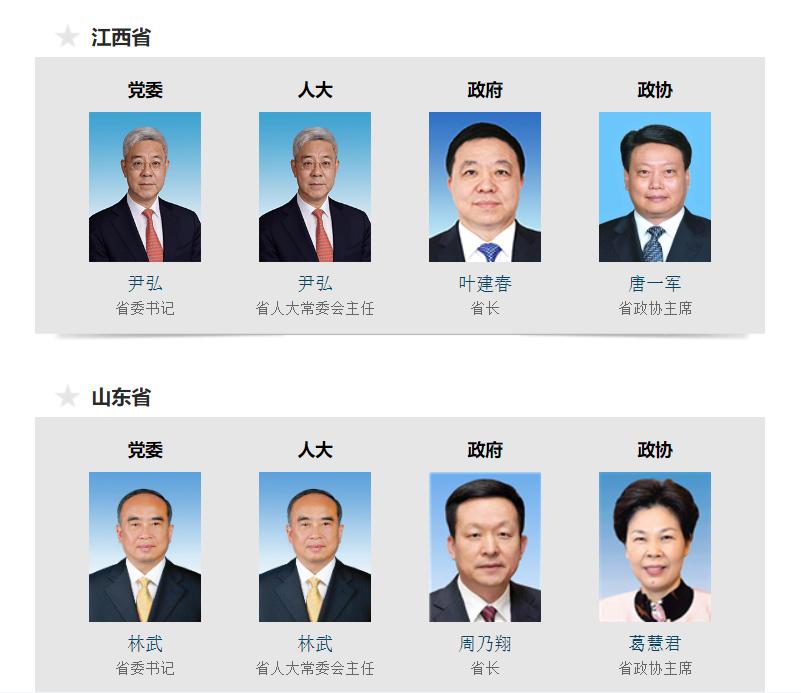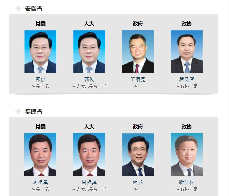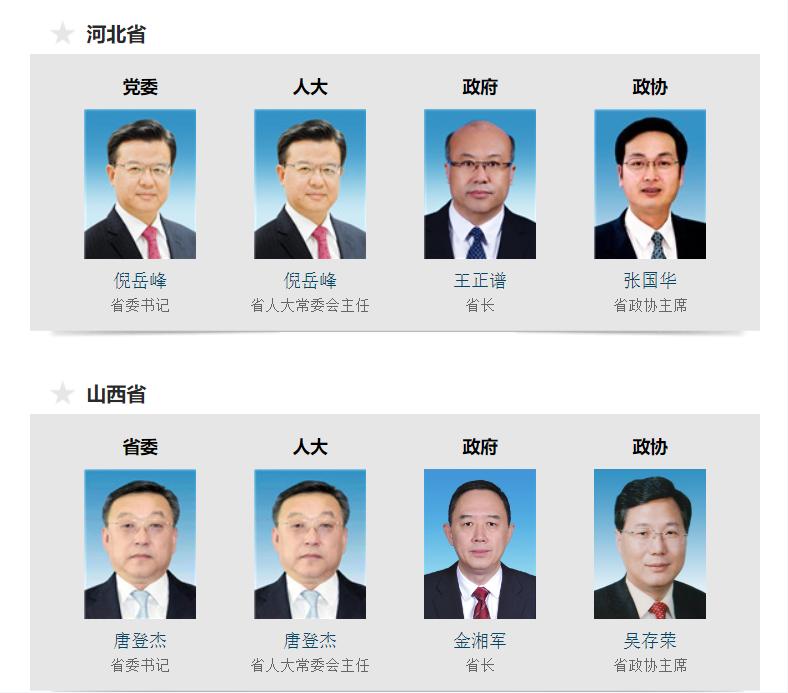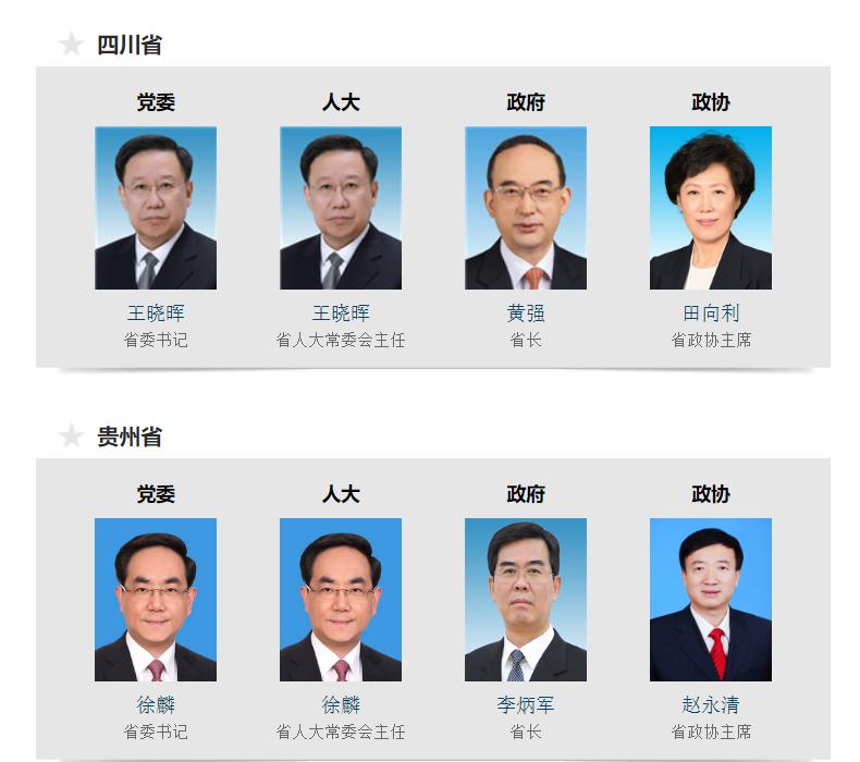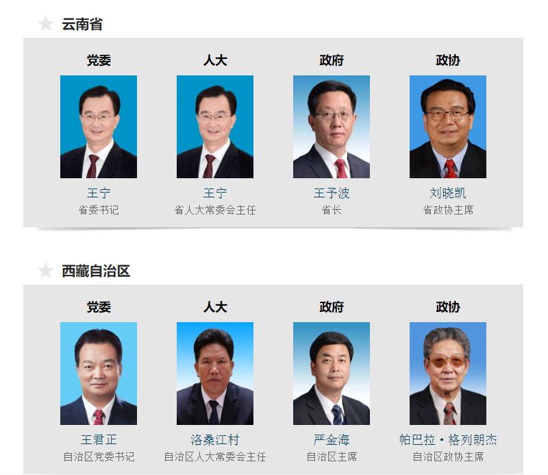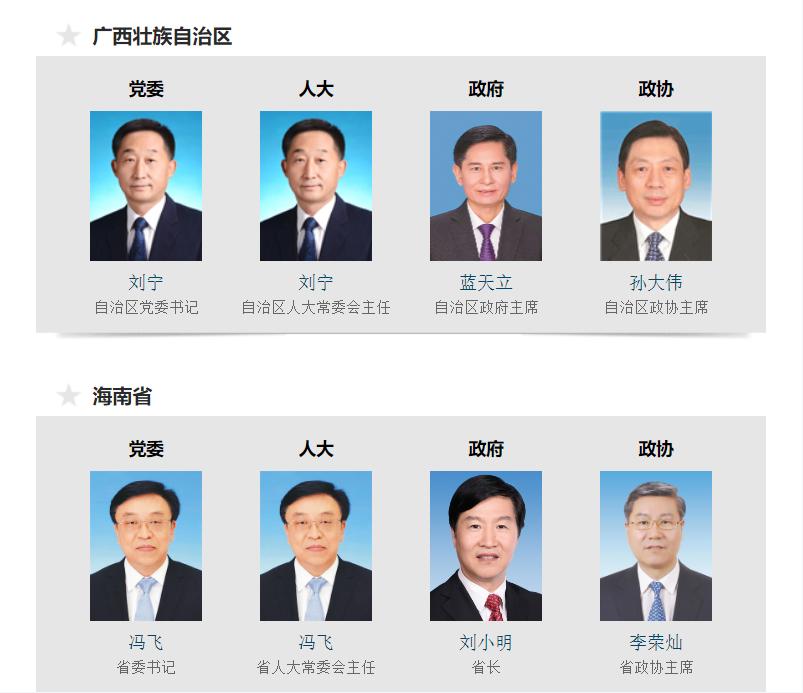 | 省區市 | 書記 | 人大常委會主任 | 省(市)長/自治區主席 | 政協主席 |