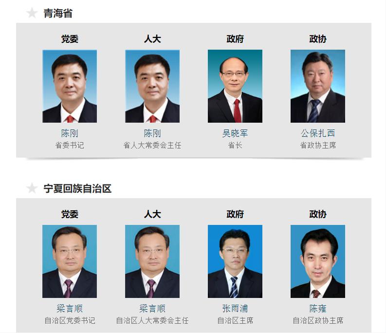 | 青海 | 陳剛 | 陳剛 | 吳曉軍 | 公保扎西 |
