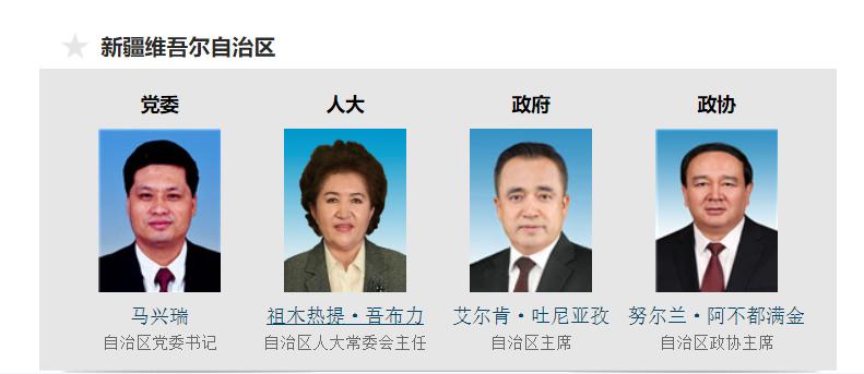 | 新疆 | 馬興瑞 | 祖木熱提·吾布力(女) | 艾爾肯·吐尼亞孜 | 努爾蘭·阿不都滿金 |