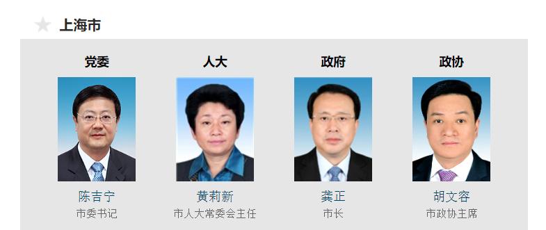 | 上海 | 陳吉寧 | 黃莉新(女) | 龔正 | 胡文容 |