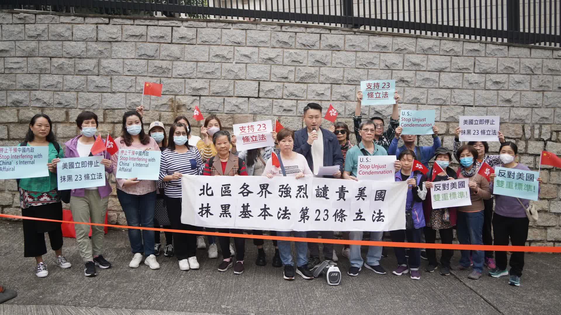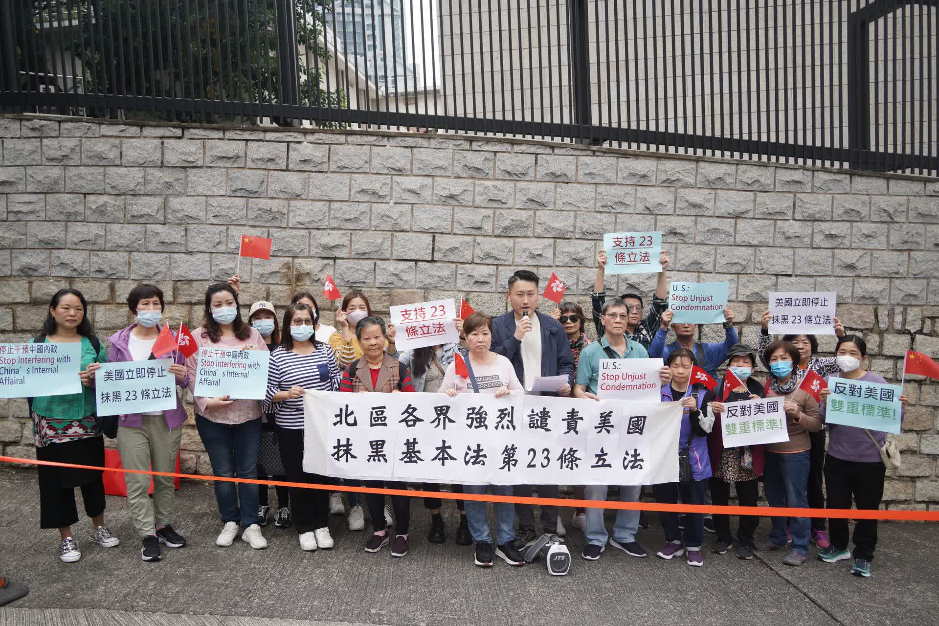 美國政府官員就香港基本法23條立法發表偏頗和具誤導性的言論,妄議香港第23條立法,連日來多批香港市民及團體到美國駐港總領事館前抗議表達不滿。昨日下午,同心護港總會、香港坊眾社會服務中心和北區市民在美國領事館外圍示威,怒撕美國國旗,並在驚蟄節氣進行「打小人」儀式。
