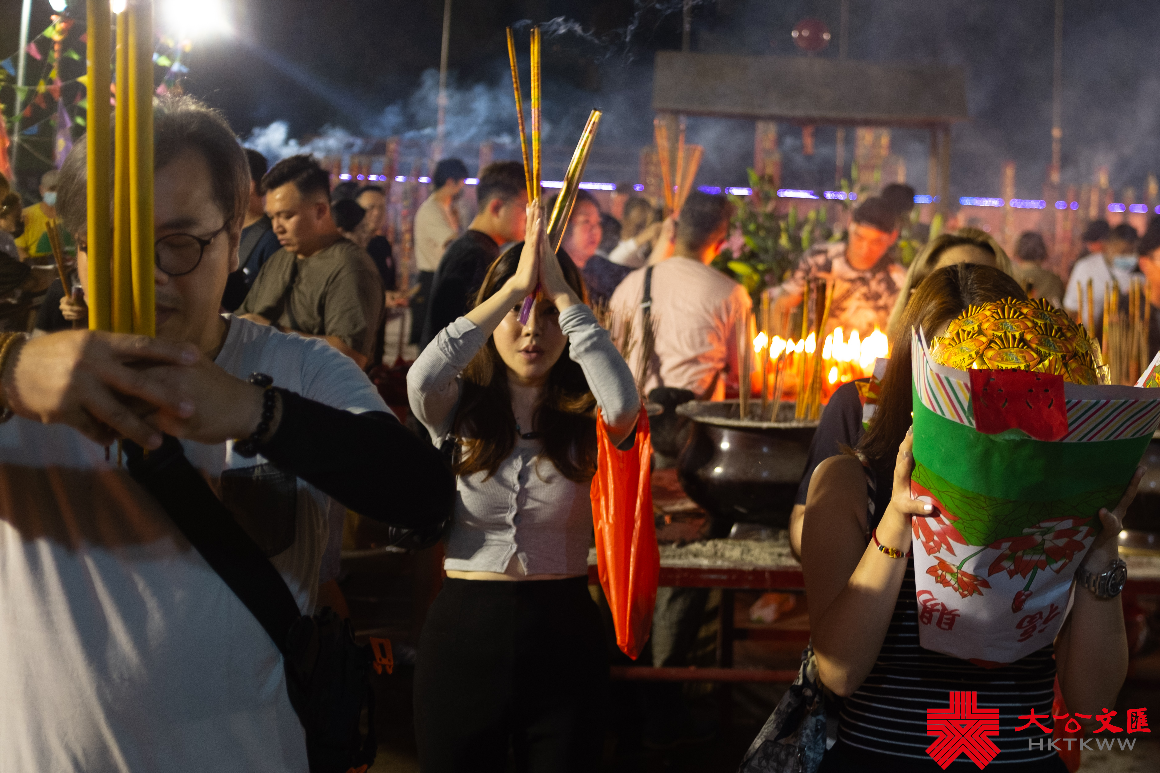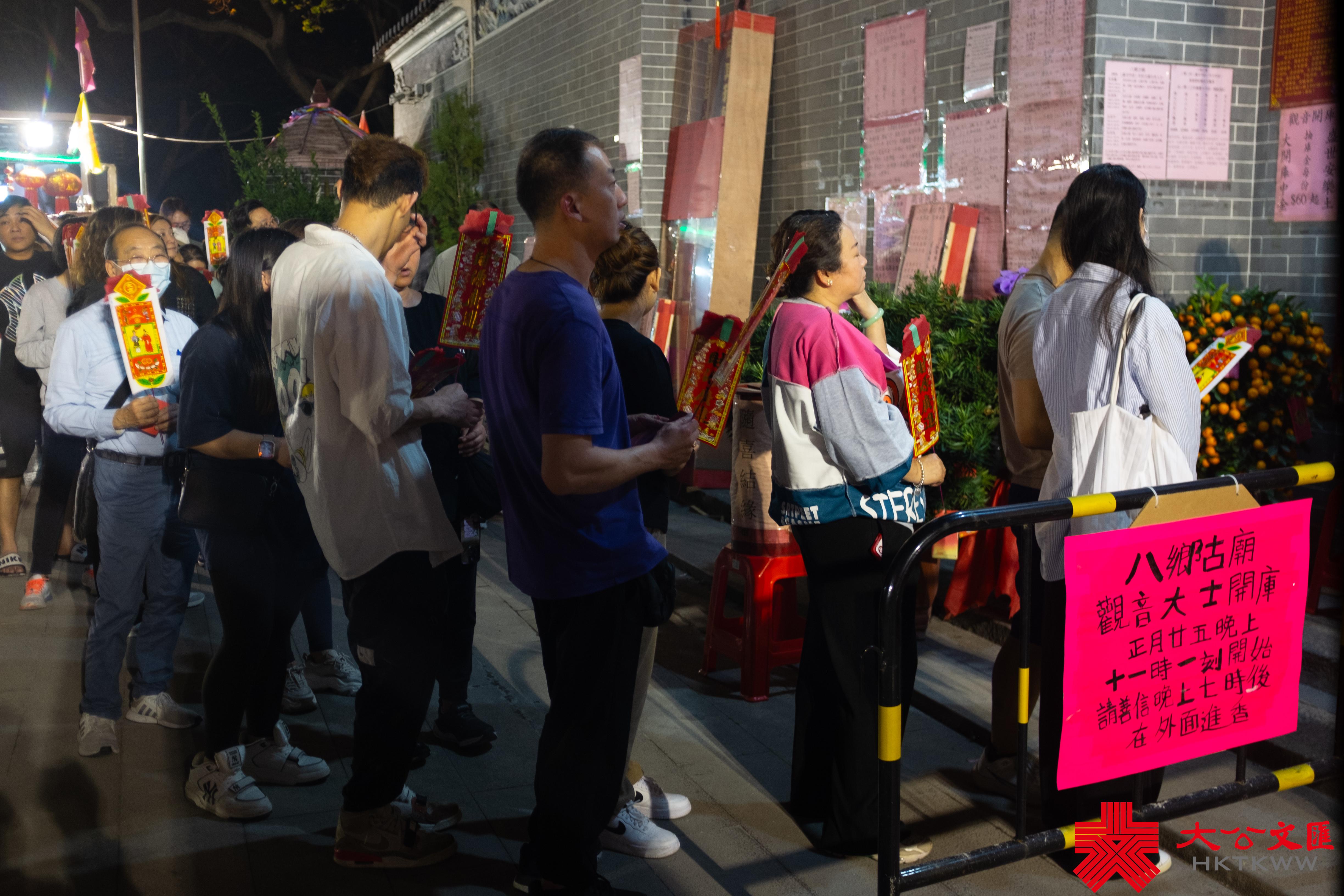 大公文匯全媒體記者晚上在元朗錦田的八鄉古廟看到,「觀音開庫」開始前已有上百名善信排隊等待,當中亦有不少年輕善信的身影。有年輕善信表示,一般每年都會來此祈求身體健康,沒有其他特別的想法。