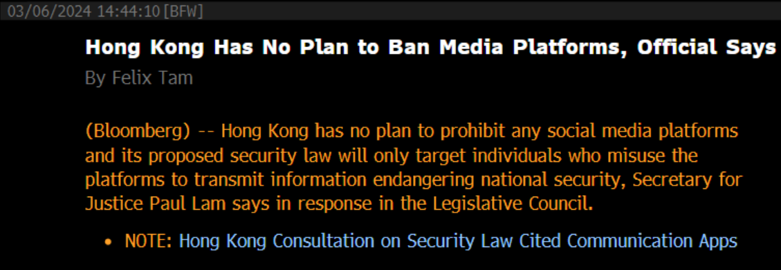 而下午2時許,律政司司長林定國在立法會聯席會議上作出澄清後,彭博才姍姍來遲發布最新消息,指特區政府表示沒有計劃禁制社交媒體。
