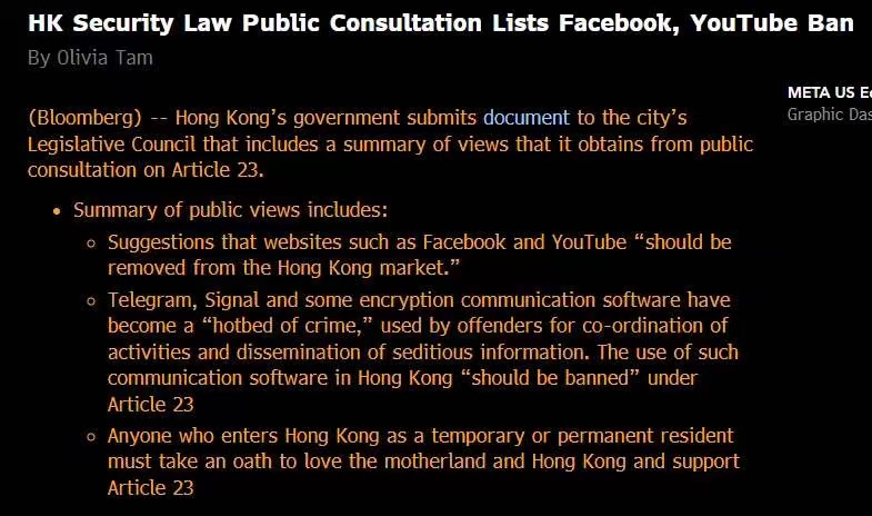 政府今日上午公布基本法23條立法公眾諮詢結果有關文件後,彭博隨即以「HK Security Law Public Consultation Lists Facebook, YouTube Ban」(香港維護國家安全法律公眾諮詢列出Facebook、YouTube禁令)為題發布報道。惟翻查原文件,「建議將Facebook、YouTube 等網站撤出香港市場」有關內容只屬23條立法公眾諮詢的書面意見摘要,並非政府回應或官方公布。