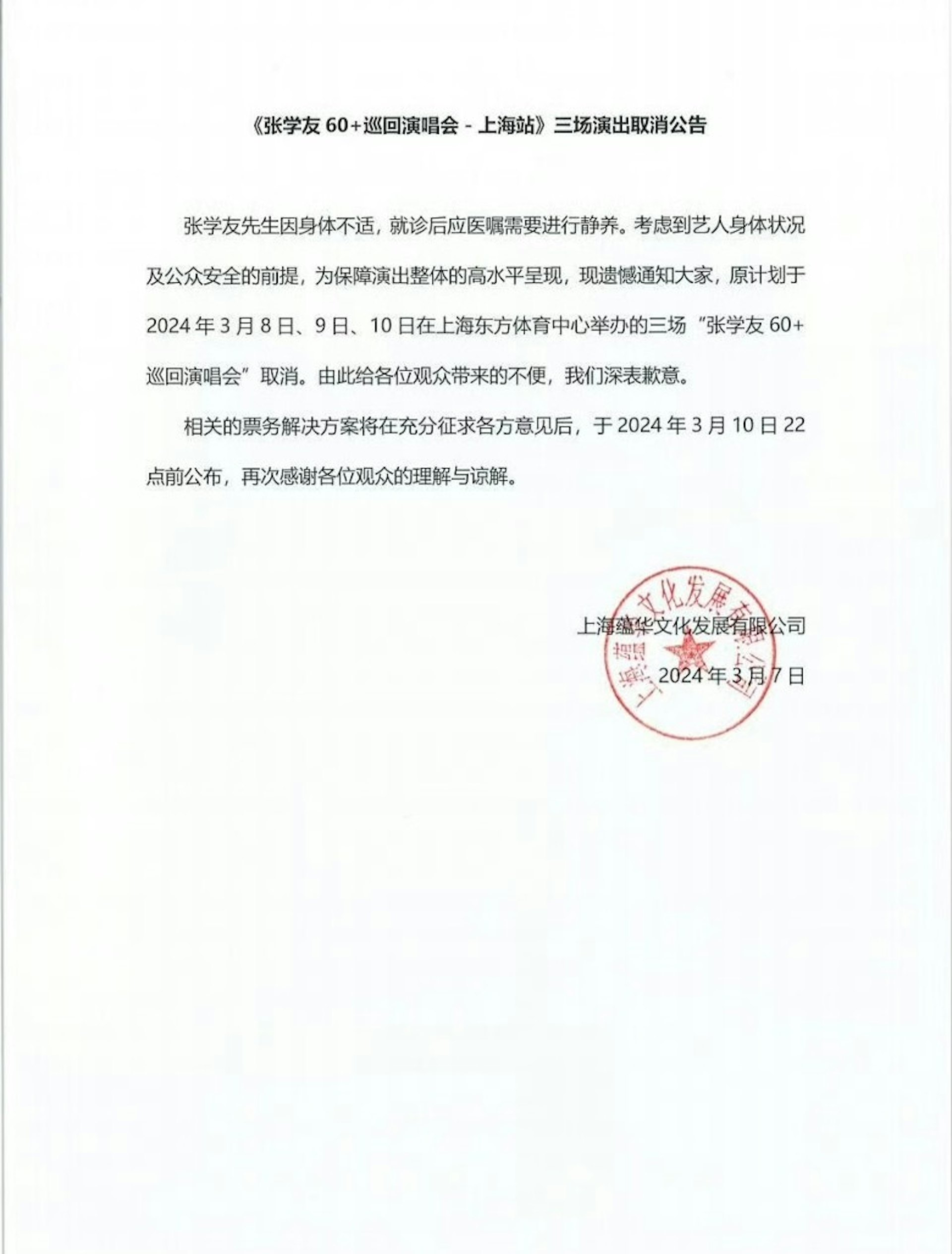 主辦方在微博發聲明:「張學友先生因身體不適,就診後應醫囑需要進行靜養。考慮到藝人身體狀況及公眾安全的前提,為保障演出整體的高水準呈現,現遺憾通知大家,原計劃於2024年3月8日、9日、10日在上海東方體育中心舉辦的三場《張學友60+巡迴演唱會》取消。由此給各位觀眾帶來的不便,我們深表歉意。」環球唱片就表示:「謝謝關心,張生在休息。」