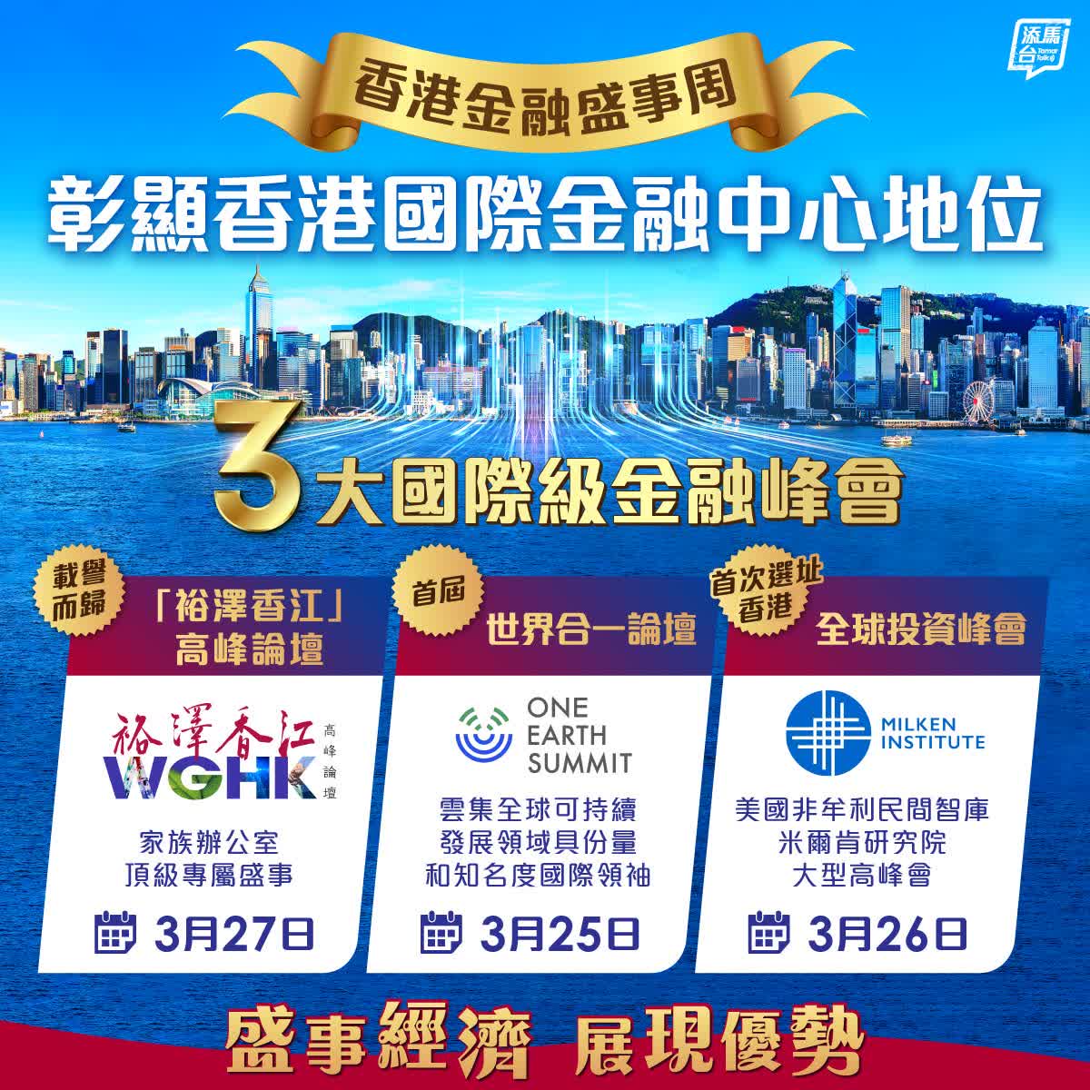 香港金融盛事周將於3月底舉行,多項國際頂級峰會及展覽活動盛大登場,彰顯香港作為國際金融中心的地位。當中包括三大國際級金融峰會:載譽而歸的家族辦公室頂級專屬盛事「裕澤香江」高峰論壇、探討全球氣候問題與綠色經濟的首屆世界合一論壇,以及米爾肯研究院舉辦的全球投資峰會,是該院自1998年來首次選址香港舉辦大型峰會。