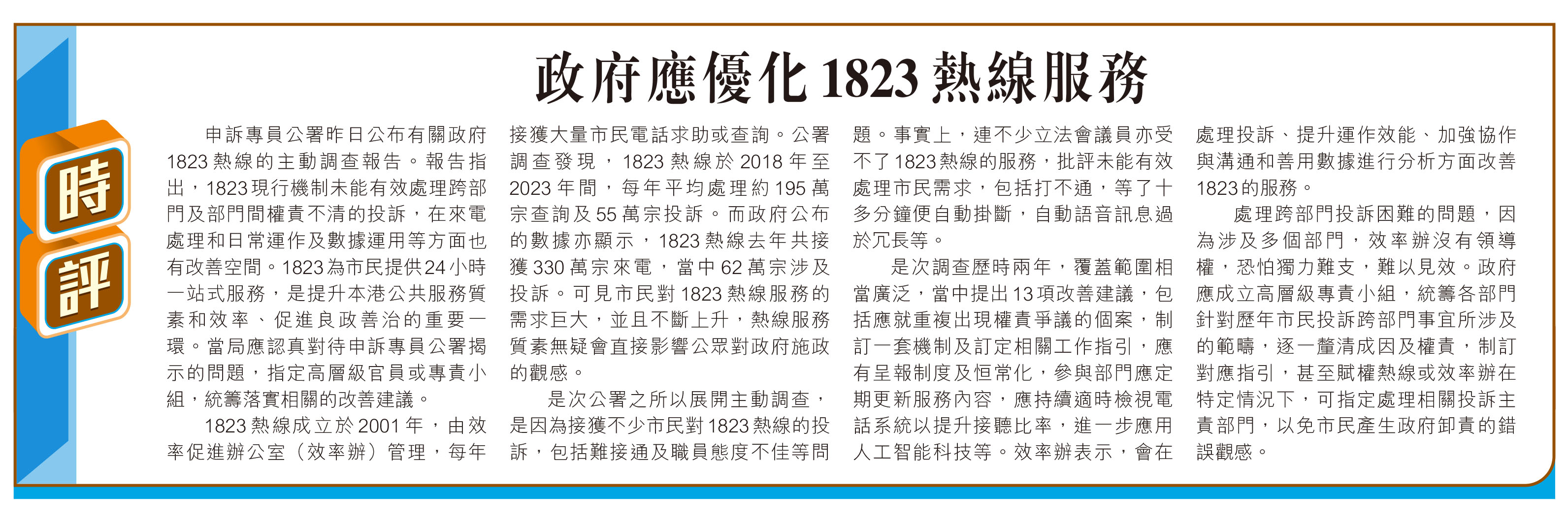 申訴專員公署昨日公布有關政府1823熱線的主動調查報告。報告指出,1823現行機制未能有效處理跨部門及部門間權責不清的投訴,在來電處理和日常運作及數據運用等方面也有改善空間。1823為市民提供24小時一站式服務,是提升本港公共服務質素和效率、促進良政善治的重要一環。當局應認真對待申訴專員公署揭示的問題,指定高層級官員或專責小組,統籌落實相關的改善建議。