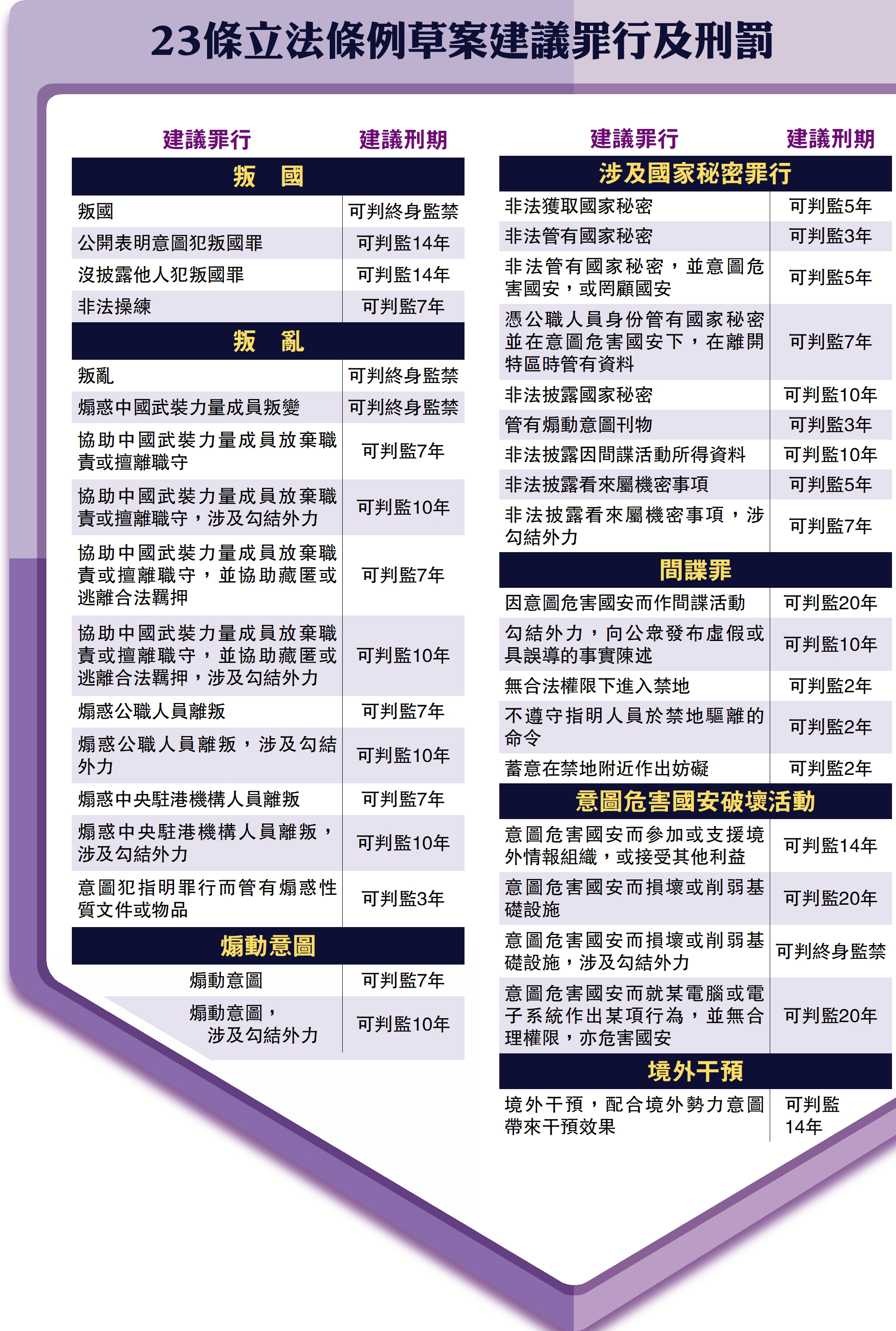 《條例草案》一共212頁,詳列各項建議的控罪及刑罰。其中,叛國、叛亂刑罰最高,一經定罪可被判處終身監禁;非法披露國家秘密一經定罪,可被判監10年;煽動意圖罪可被判監七年。其他罪行如涉及勾結外國或境外勢力,會被加刑。