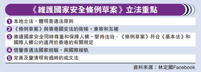 律政司司長林定國在社交媒體發文強調五個立法重點。他指出,草案借鑒了海外其他維護國家安全法例,審慎詳細考慮了香港的實際情況,草擬最合適香港的法律。他說,草案眾多的條文並非是全新的事情,當中不少的條文是完善和釐清現行的普通法和一些過時的成文法,特區政府是很有信心條例草案是完整管用、具有前瞻性和靈活性,相信草案審議後,將會補上香港維護國家安全法律最後的一塊短板,讓香港有完整維護國家安全的法律系統。