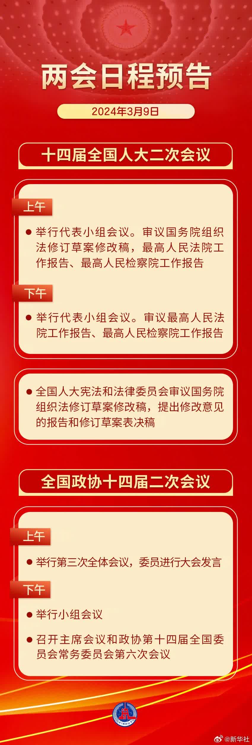 十四屆全國人大二次會議9日全天舉行代表小組會議。上午,審議國務院組織法修訂草案修改稿,最高人民法院工作報告、最高人民檢察院工作報告;下午,審議最高人民法院工作報告、最高人民檢察院工作報告。