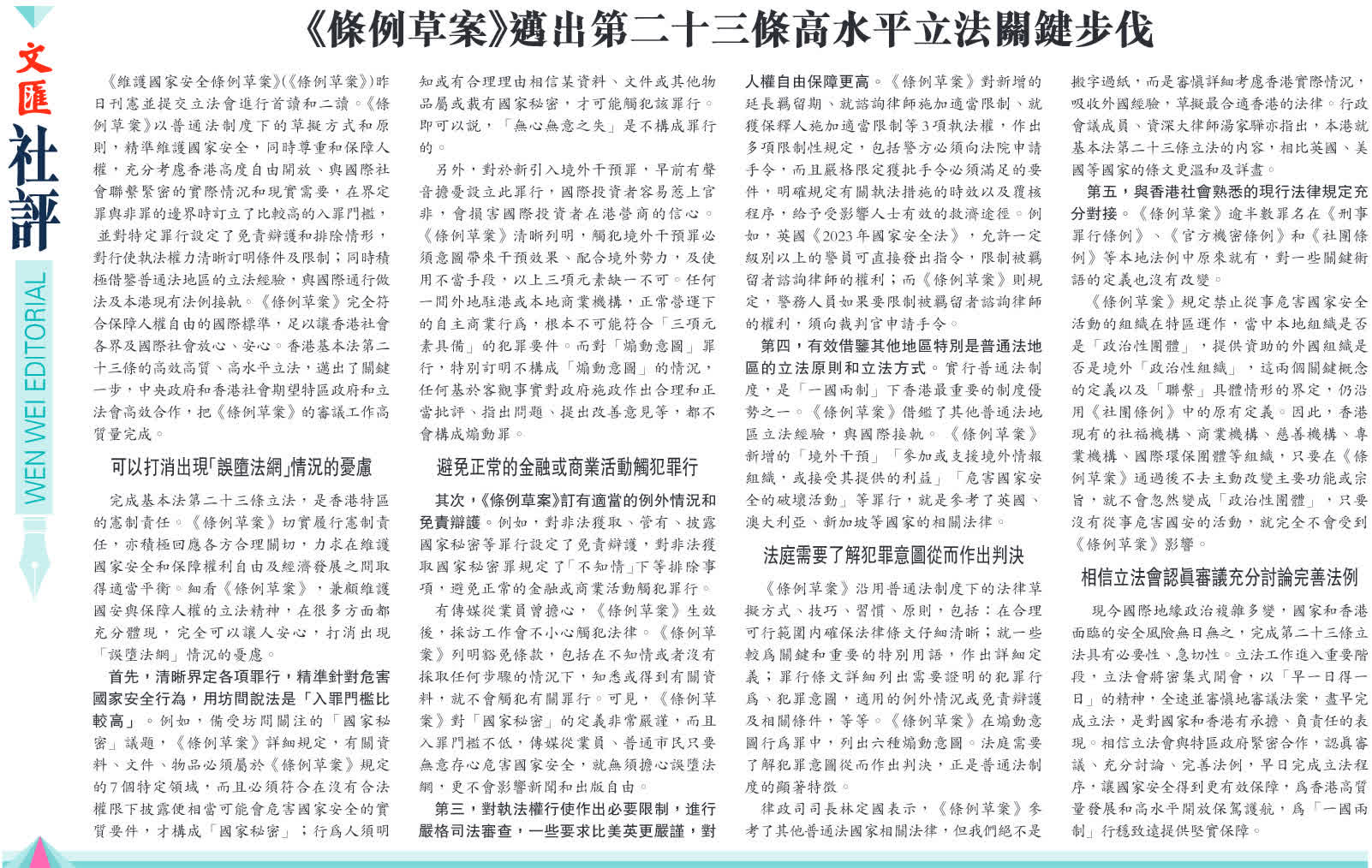 《維護國家安全條例草案》(《條例草案》)昨日刊憲並提交立法會進行首讀和二讀。《條例草案》以普通法制度下的草擬方式和原則,精準維護國家安全,同時尊重和保障人權,充分考慮香港高度自由開放、與國際社會聯繫緊密的實際情況和現實需要,在界定罪與非罪的邊界時訂立了比較高的入罪門檻,並對特定罪行設定了免責辯護和排除情形,對行使執法權力清晰訂明條件及限制;同時積極借鑒普通法地區的立法經驗,與國際通行做法及本港現有法例接軌。《條例草案》完全符合保障人權自由的國際標準,足以讓香港社會各界及國際社會放心、安心。香港基本法第二十三條的高效高質、高水平立法,邁出了關鍵一步,中央政府和香港社會期望特區政府和立法會高效合作,把《條例草案》的審議工作高質量完成。