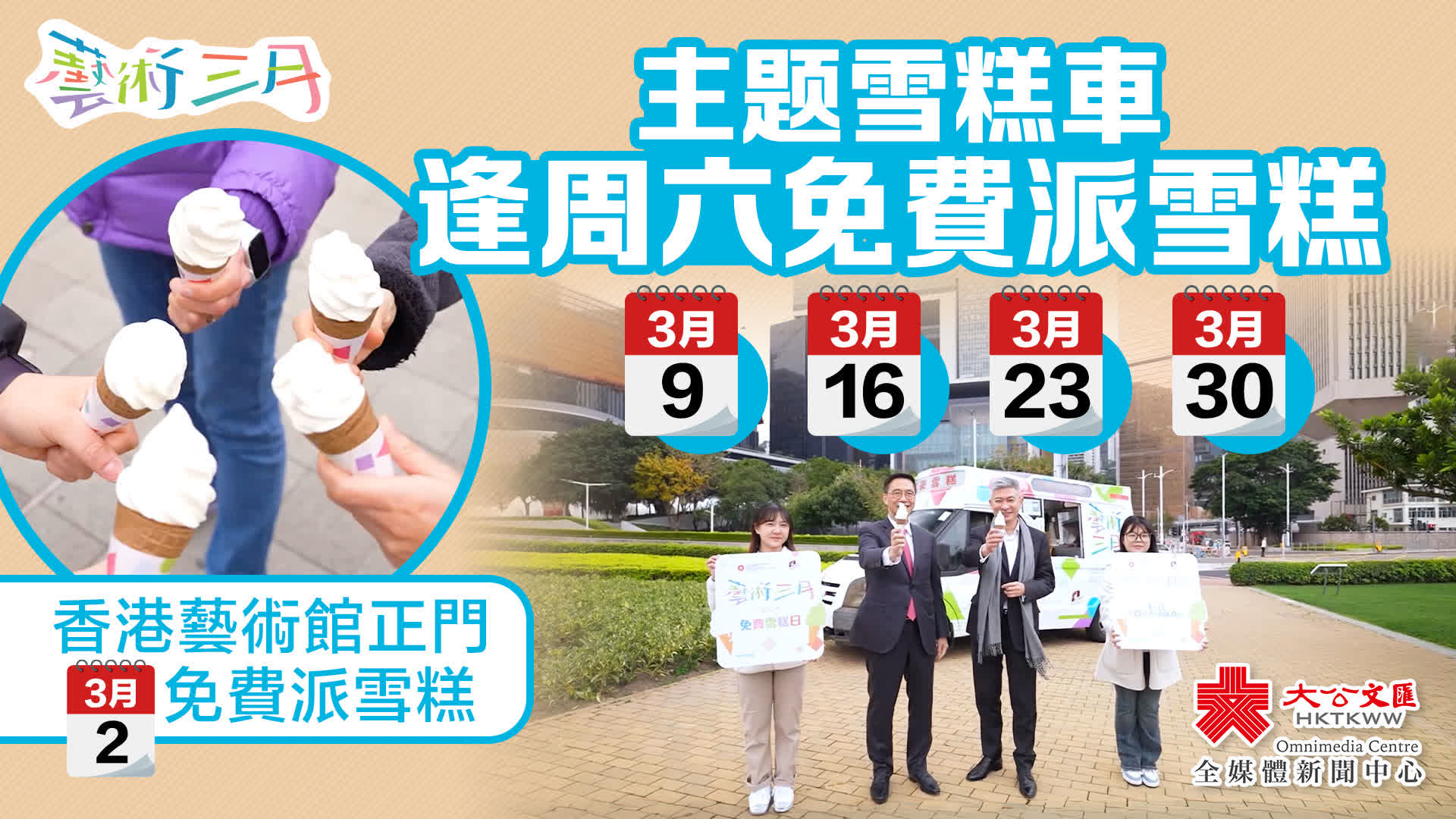 大公文匯全媒體報道,藝術三月,多場文化與藝術盛宴將在維港兩岸上演!以「藝術三月」為主題的雪糕車將在3月的四個星期六,即今日(3月9日)、16日、23日和30日,遊走香港各區免費派雪糕。