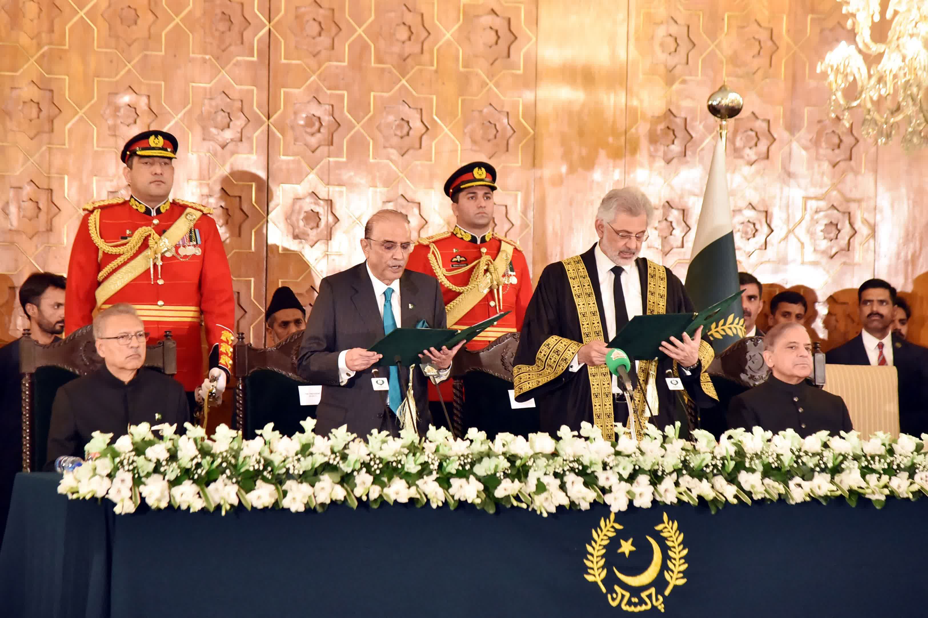 巴基斯坦最高法院首席大法官卡齊·法伊茲·伊薩主持宣誓儀式。巴總理夏巴茲、國民議會(議會下院)議長薩迪克、前總統阿爾維、陸軍參謀長穆尼爾、人民黨主席比拉瓦爾等出席儀式。