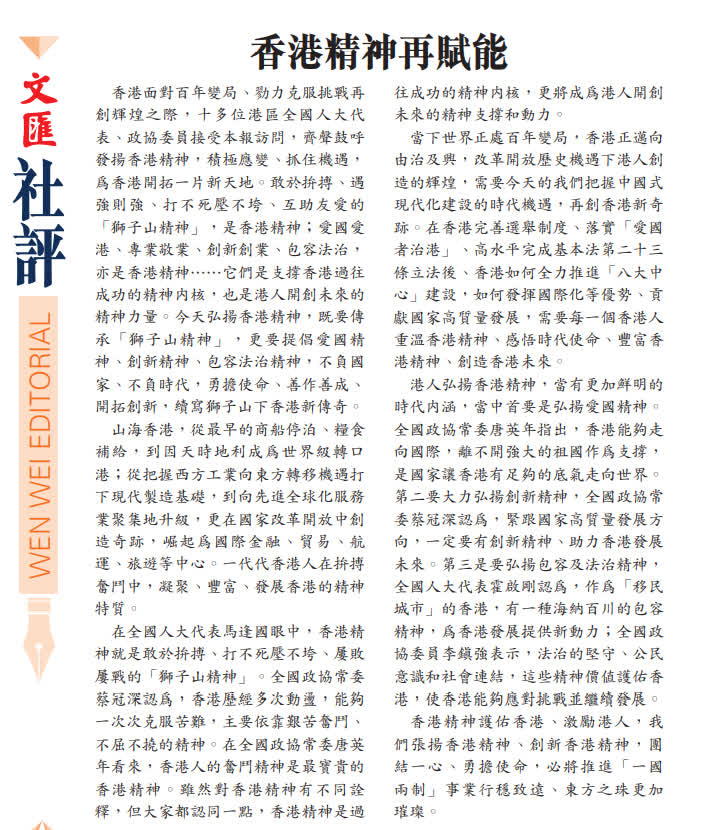香港面對百年變局、勠力克服挑戰再創輝煌之際,十多位港區全國人大代表、政協委員接受本報訪問,齊聲鼓呼發揚香港精神,積極應變、抓住機遇,為香港開拓一片新天地。敢於拚搏、遇強則強、打不死壓不垮、互助友愛的「獅子山精神」,是香港精神;愛國愛港、專業敬業、創新創業、包容法治,亦是香港精神……它們是支撐香港過往成功的精神內核,也是港人開創未來的精神力量。今天弘揚香港精神,既要傳承「獅子山精神」,更要提倡愛國精神、創新精神、包容法治精神,不負國家、不負時代,勇擔使命、善作善成、開拓創新,續寫獅子山下香港新傳奇。