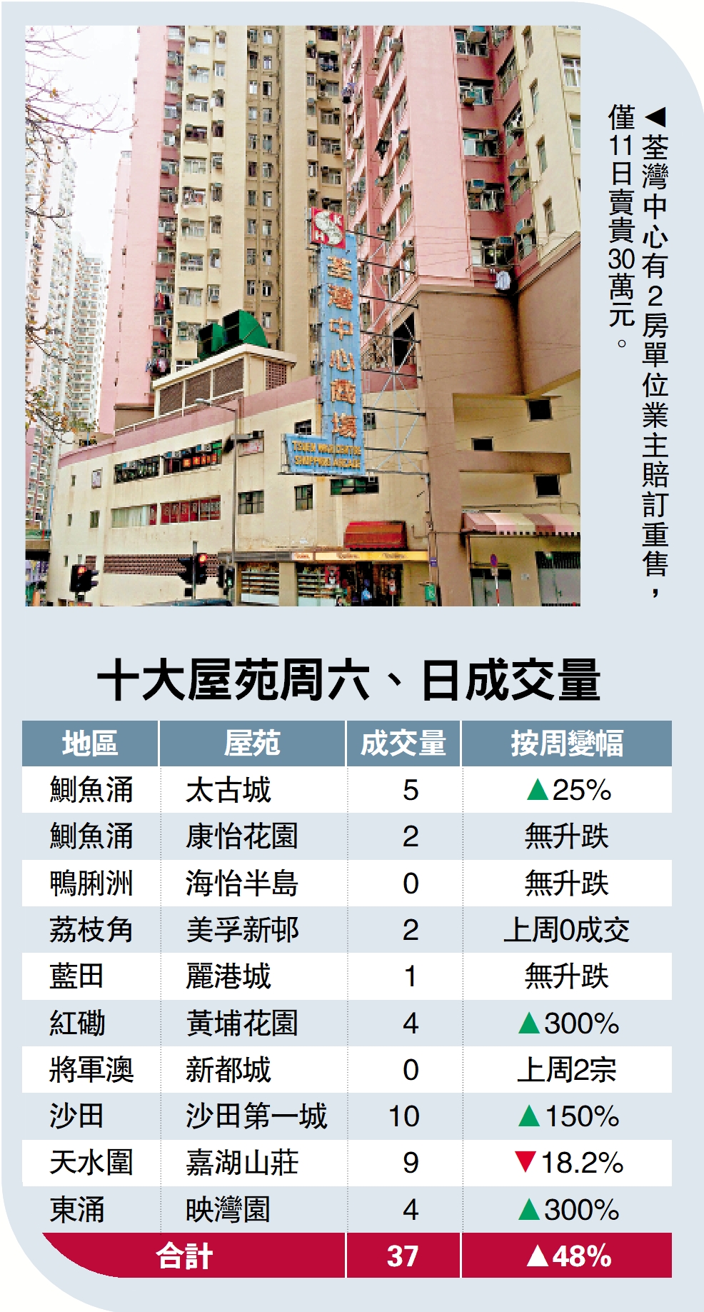 (大公報記者 林惠芳)特區政府全面撤辣後,樓市購買力湧現,十大屋苑於過去周末錄37宗成交,創逾3年新高。買家憂遲買會貴積極追價,荃灣中心有業主趁機賠訂,以318萬重售單位,短短11日賣貴30萬10.4%。