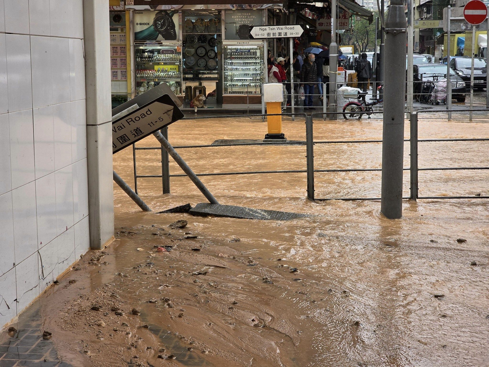 大公文匯全媒體報道,今日(11日)下午1時42分,九龍城衙前圍道及城南道交界發生爆水管,大量黃泥水湧出,淹浸十字路口,且地面凹陷致街牌傾斜。