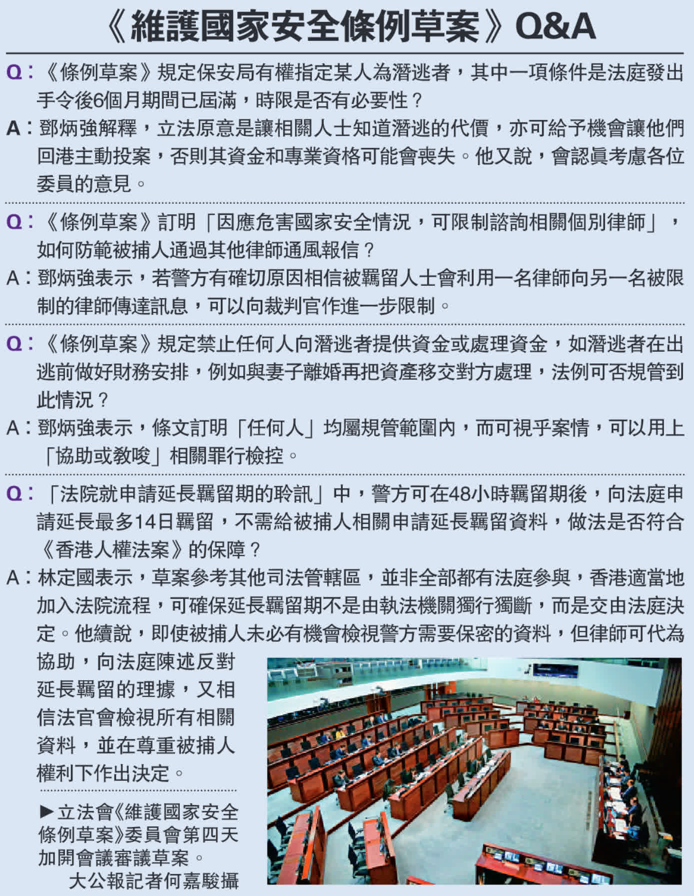 立法會《維護國家安全條例草案》法案委員會審議工作如火如荼,大公報記者連日在會場所見,議員仔細嚴謹地逐條審議《條例草案》,發現有疑問時逐一質詢出席官員,不時爆出尖銳提問,包括有關條文是否符合人權法案等,以及「批評政府是否違法」等,令記者全日都「豎起耳仔」,會議氣氛可謂相當熱烈。