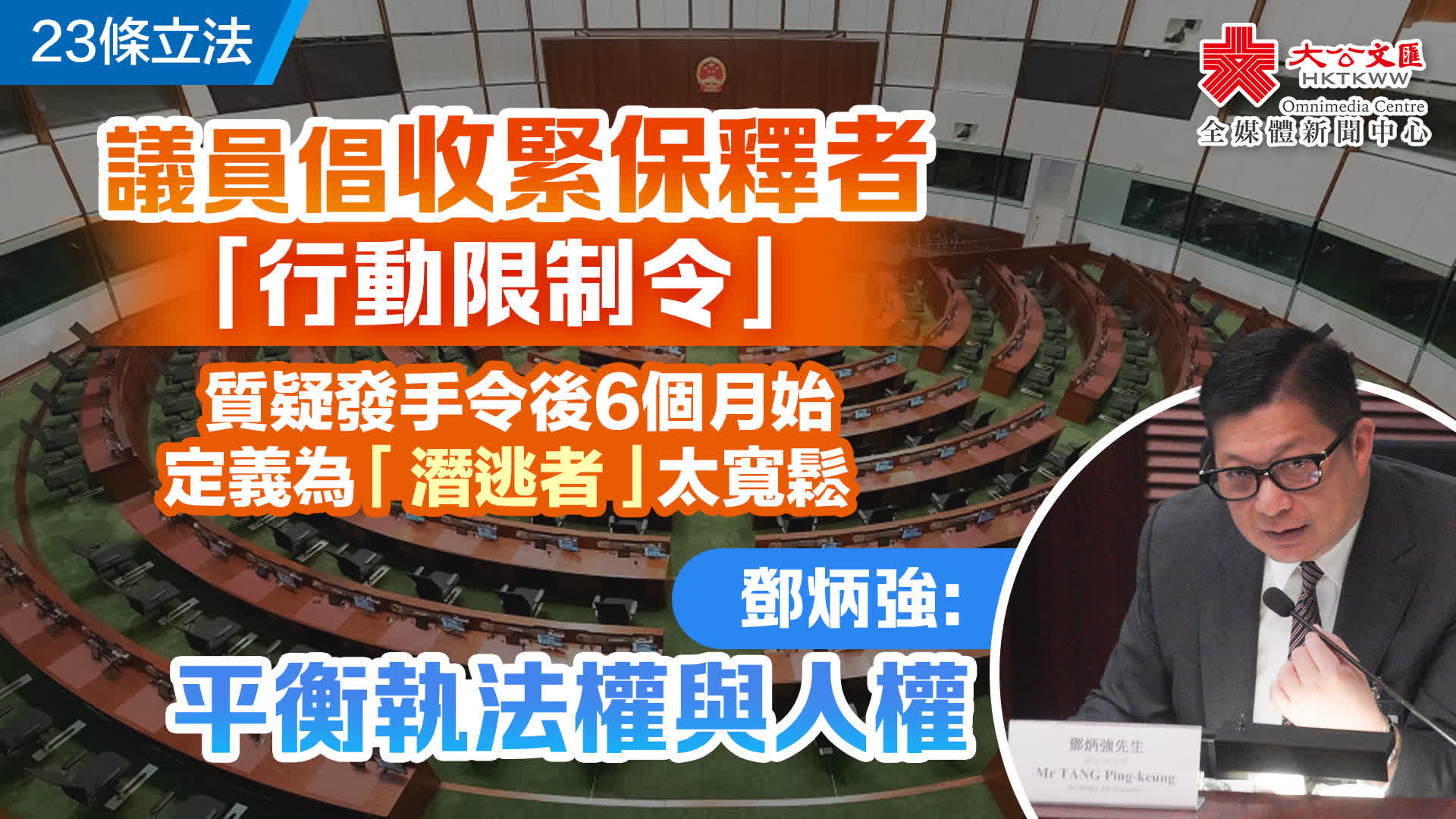 《條例草案》提出,警方可為違反國安罪行的保釋者施加限制,包括向法庭提出申請「行動限制令」,限制保釋者在指明地方居住、聯絡指明人士等。會上,多名議員認為有關內容「不夠辣」。