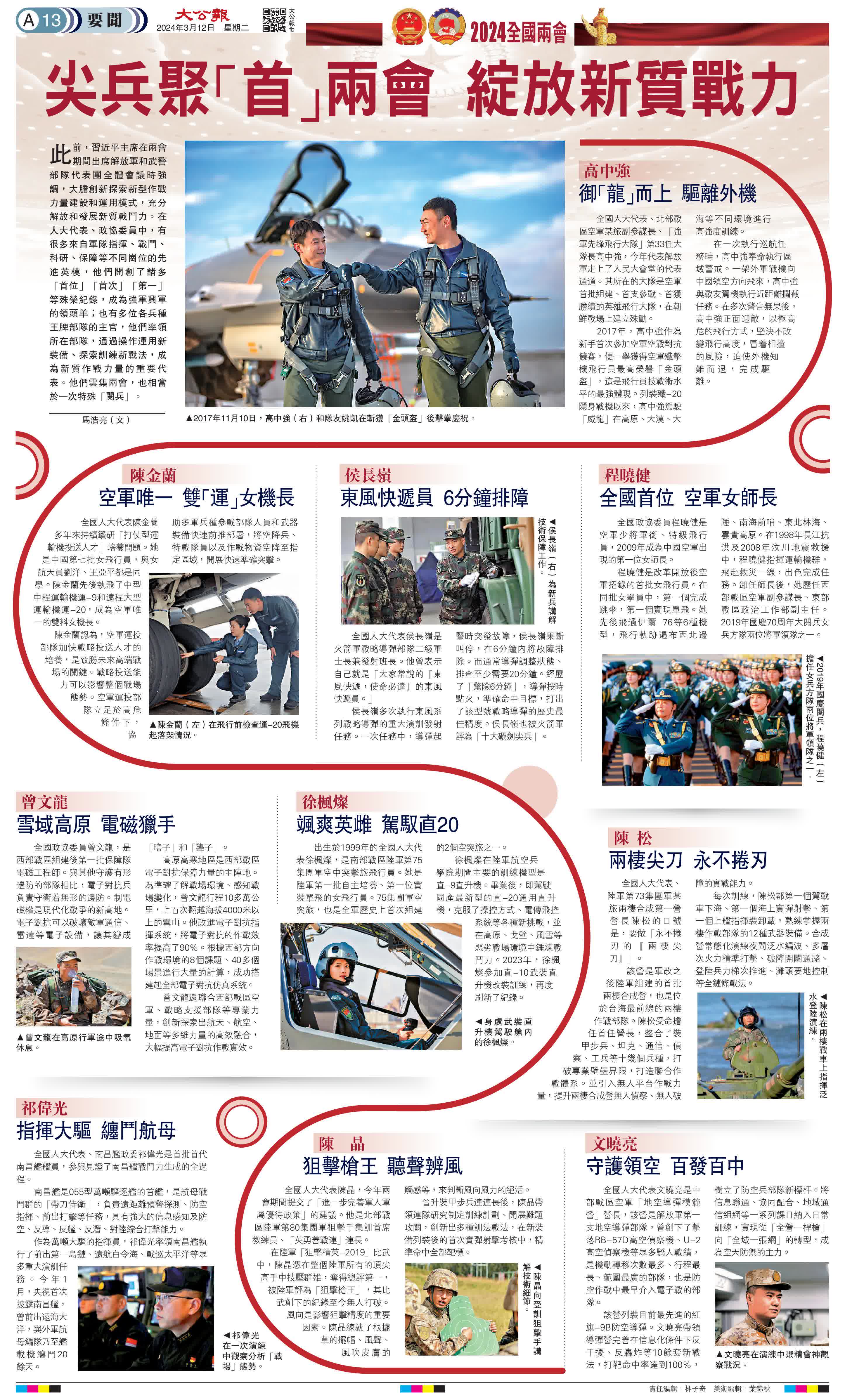 此前,習近平主席在兩會期間出席解放軍和武警部隊代表團全體會議時強調,大膽創新探索新型作戰力量建設和運用模式,充分解放和發展新質戰鬥力。在人大代表、政協委員中,有很多來自軍隊指揮、戰鬥、科研、保障等不同崗位的先進英模,他們開創了諸多「首位」「首次」「第一」等殊榮紀錄,成為強軍興軍的領頭羊;也有多位各兵種王牌部隊的主官,他們率領所在部隊,通過操作運用新裝備、探索訓練新戰法,成為新質作戰力量的重要代表。他們雲集兩會,也相當於一次特殊「閱兵」。