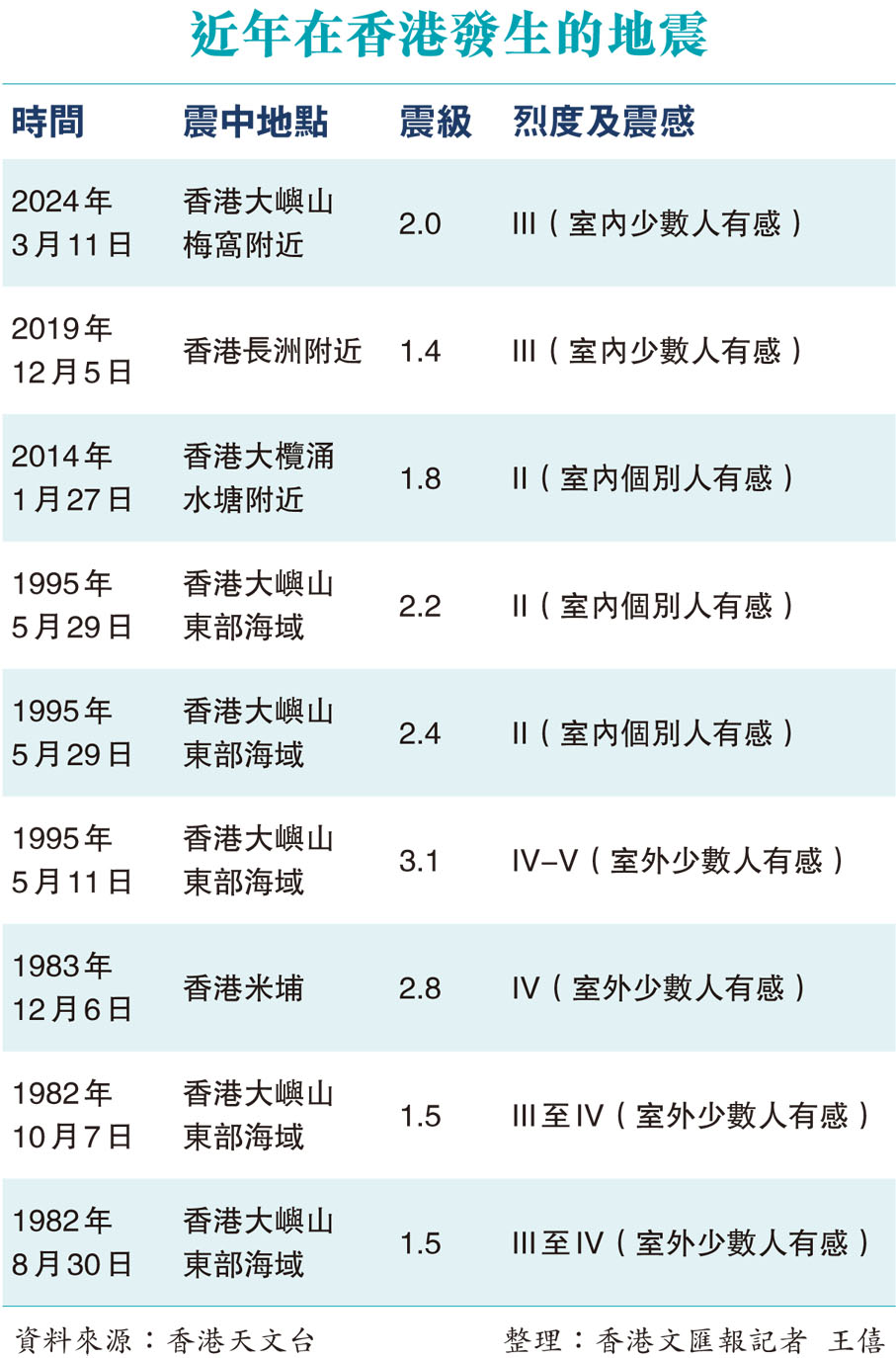 (香港文匯報記者 王僖、聶曉輝)香港天文台昨日下午在大嶼山梅窩附近錄得一次罕見的2.0級弱地震,是香港42年來第九次震源在境內的地震,亦是第二次在陸地發生的地震。「震感如同小型貨車駛過」,天文台昨日接獲逾百人報告感到地震,家住梅窩銀礦灣的潘小姐是其中一人。她在接受香港文匯報採訪時形容:「當時我喺屋企,突然轟一聲持續幾秒,我還以為是行雷,後來才知是地震!」她從小在梅窩長大,在現址居住了逾20年,多年前也曾感受過一次地震,「那次感覺強烈一點,猶如大型貨車駛過一樣,維持了好幾秒。」有學者強調,香港不是位於地震帶,受地震影響輕微,今次可能是「斷裂帶」滑動,產生偶發性的小型地震。