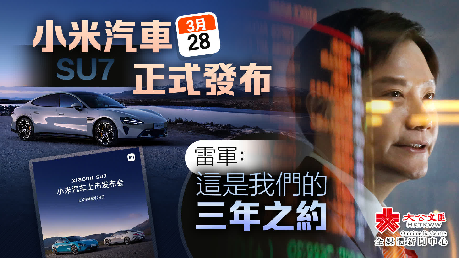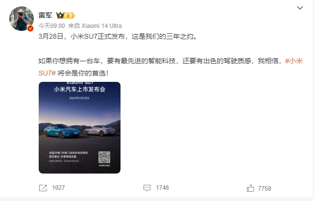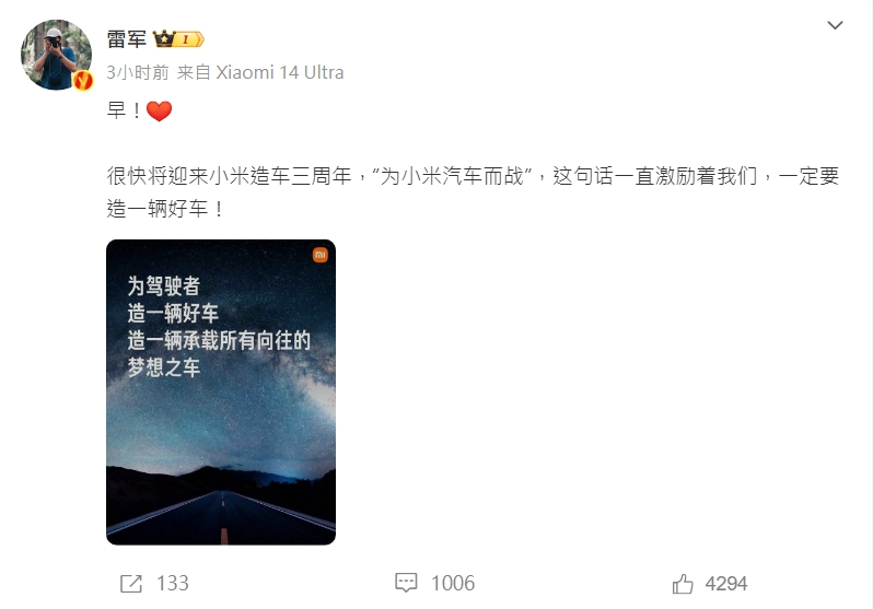小米董事長雷軍亦於博微發文表示:「很快將迎來小米造車三周年,為小米汽車而戰,這句話一直激勵着我們,一定要造一輛好車!」他其後再稱「3月28日,小米SU7正式發布,這是我們的三年之約」,指如果想擁有一台車,要有最先進的智能科技,還要有出色的駕駛質感,相信小米SU7將會是首選。