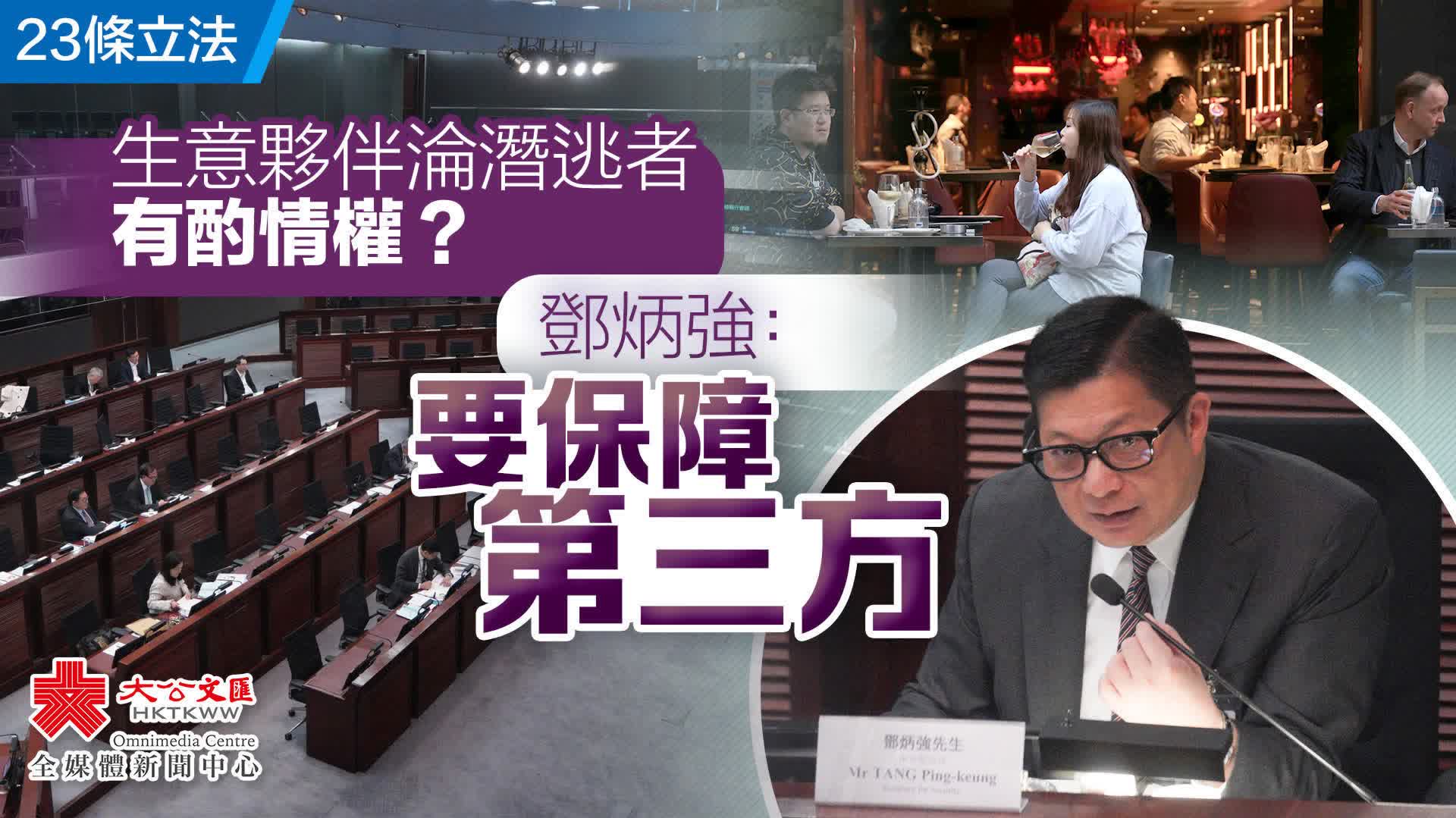 (大公文匯全媒體 記者 王俊傑)今日(3月12日),立法會《維護國家安全條例草案》委員會連續第五日加會,討論基本法23條立法草案。條例訂明,當局可以令潛逃者在經營業務或受僱工作的准許或註冊暫時無效,有議員關注如何處理涉及第三方的經營或合資情況,保安局局長鄧炳強強調,當局有酌情權,以保障相關權利。