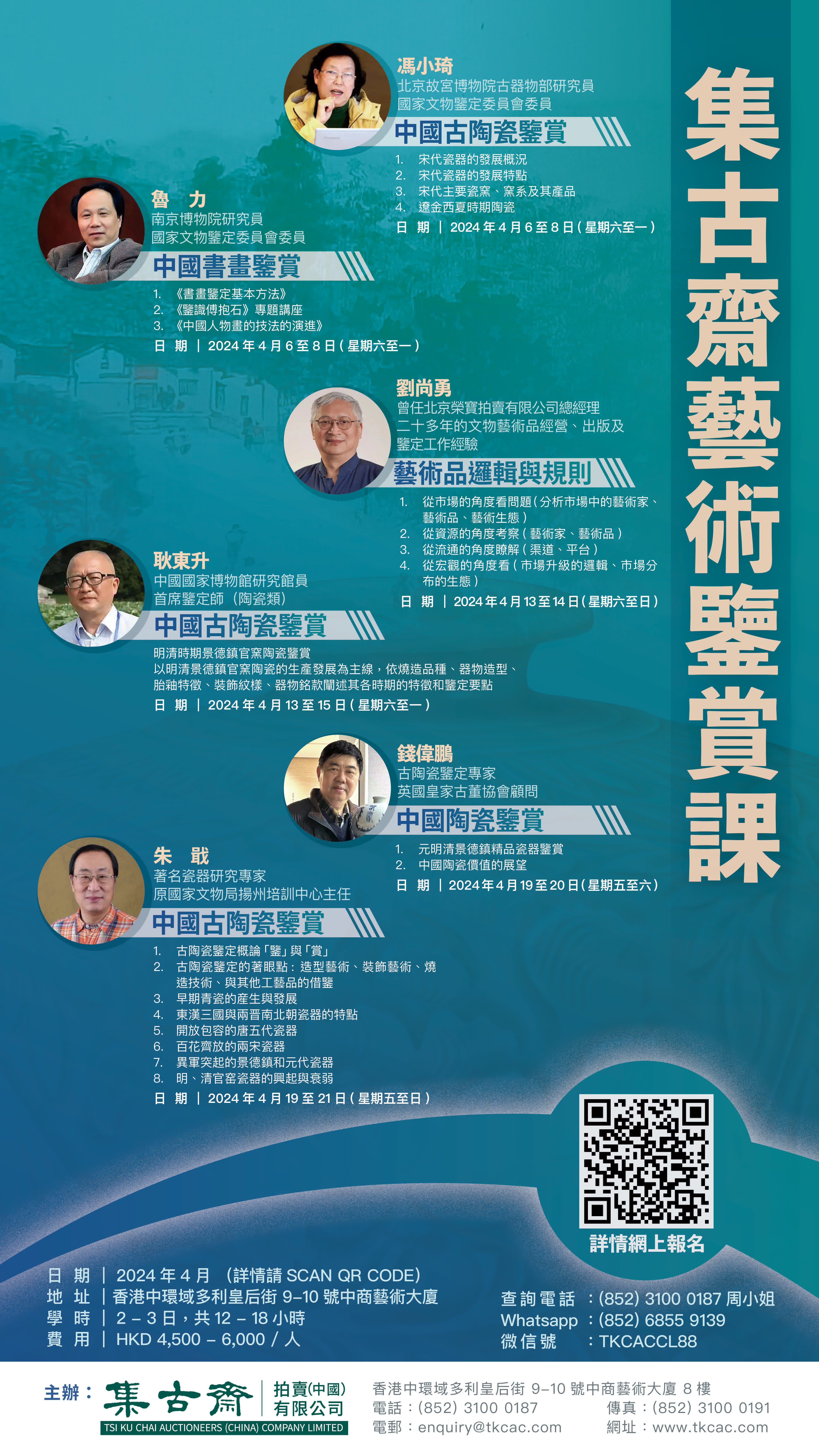 據悉,是次課程為集古齋藝術鑒賞課的首期培訓,日後將長期開展。首期課程內容涉及多個主題,由淺入深,適合所有藝術品愛好者。導師將系統性地將中國書畫、中國古陶瓷、藝術品市場等知識全貌展現在學員面前,並梳理鑒定專業理論知識,在實戰中學習賞析和收藏投資的實用知識。本課程將於四月逢週末集中進行,地址為中環域多利皇后街9號中商藝術大廈5樓。課程完成後學員將獲頒發結業證書。詳情請瀏覽集古齋拍賣官網: www.tkcac.com
