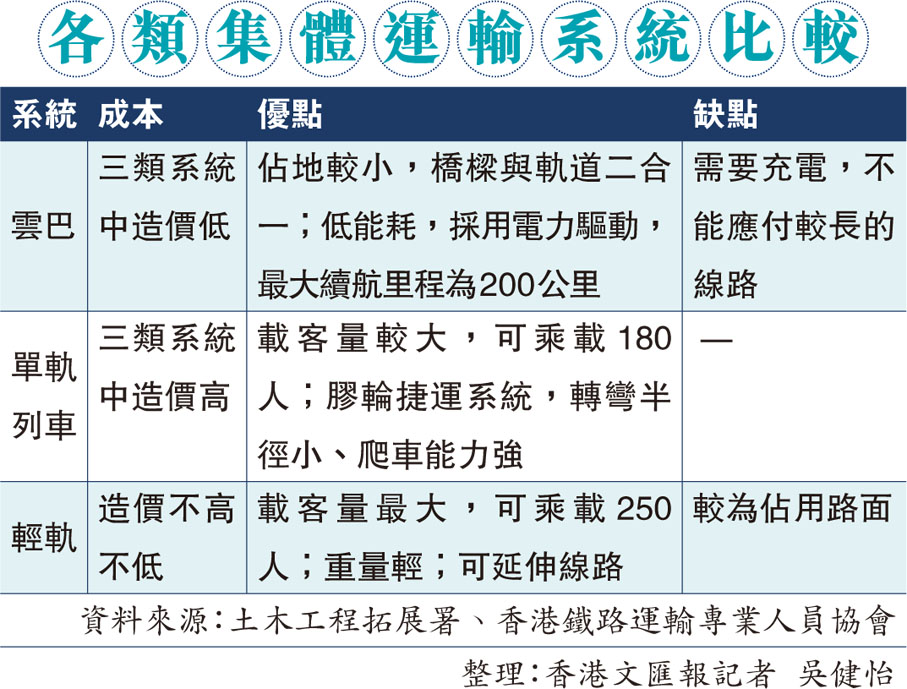 目前有自動駕駛系統的電動環保集運系統,包括有軌電動列車如雲巴、吊軌、智軌等,以及行駛專用道路的巴士快速交通系統,政府現階段沒傾向選擇哪種系統。顏汶羽說:「民建聯收集居民意見,都希望使用有軌集運,始終運力相差太多,快速巴士每架車就運數十至一百人,有軌集運一次運送數百至一千人,而且快速巴士還佔用路面。」