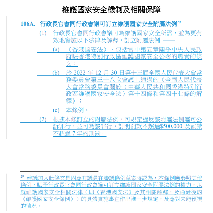 政府在修正案中建議,賦權行政長官會同行政會議可訂立維護國家安全附屬法例,以應對未能預視的情況,違附屬法例者最高可罰款50萬元及監禁7年。