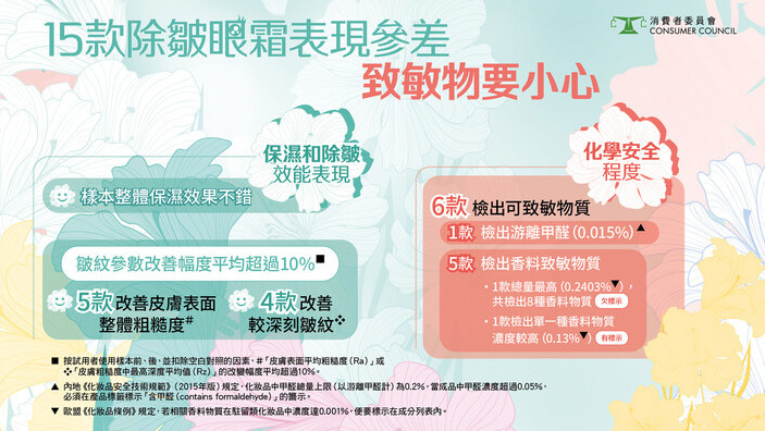 大公文匯全媒體報道,眼睛是靈魂之窗,隨着年齡的增長,眼部皮膚難免會出現不同深淺程度的皺紋和細紋。坊間有林林總總的眼霜,不少聲稱有助用家減淡,甚或撫平皺紋、細紋等歲月痕跡。消委會今日(14日)表示,近日測試了15款除皺眼霜樣本,發現全部樣本保濕效果不錯,但只有4款樣本改善較深皺紋的效果較為顯著,有6款樣本檢出遊離甲醛或香料致敏物;當中除皺效果最理想的樣本,所檢出的香料致敏物總量最高,致敏種類多達8種。