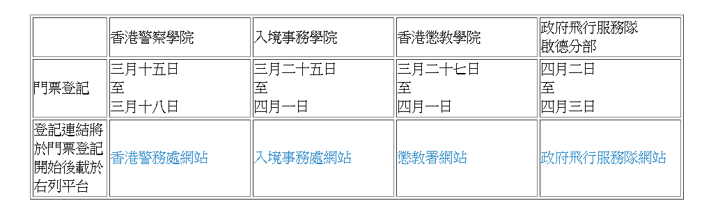香港警察學院、入境事務學院、香港懲教學院和政府飛行服務隊啟德分部將於4月13日舉行開放日,而香港海關學院、消防及救護學院、民眾安全服務隊總部和醫療輔助隊總部則於4月14日開放。