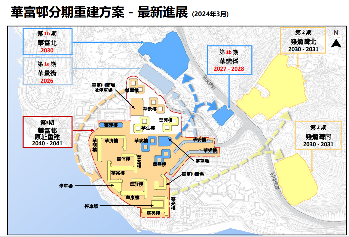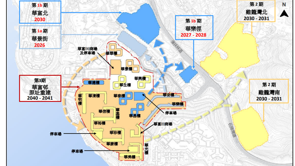發言人表示,因應這個情況,政府希望盡早啟動重建計劃,所以將第一期再細分為第1a期及第1b期:將華景街用地落成入伙定為第1a期,華樂徑及華富北用地落成入伙定為第1b期。至於第二期雞籠灣南及雞籠灣北的落成日期則維持在2030年至2031年不變,而第三期的華富邨原址重建落成時間亦維持於約2040年至2041年。